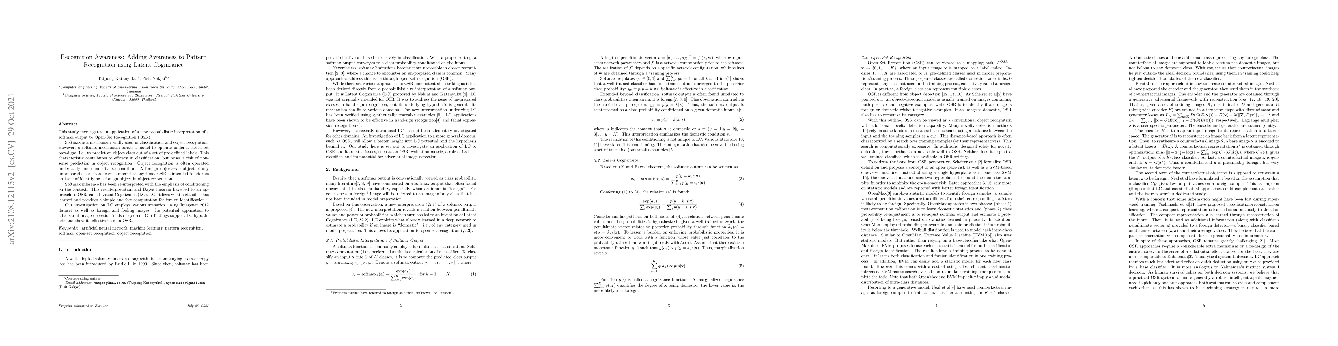 This study investigates an application of a new probabilistic interpretation of a softmax output to Open-Set Recognition (OSR). Softmax is a mechanism wildly used in classification and object recognition. However, a softmax mechanism forces a model to operate under a closed-set paradigm, i.e., to predict an object class out of a set of pre-defined labels. This characteristic contributes to efficacy in classification, but poses a risk of non-sense prediction in object recognition. Object recognition is often operated under a dynamic and diverse condition. A foreign object -- an object of any unprepared class -- can be encountered at any time. OSR is intended to address an issue of identifying a foreign object in object recognition. Based on Bayes theorem and the emphasis of conditioning on the context, softmax inference has been re-interpreted. This re-interpretation has led to a new approach to OSR, called Latent Cognizance (LC). Our investigation employs various scenarios, using Imagenet 2012 dataset as well as fooling and open-set images. The findings support LC hypothesis and show its effectiveness on OSR.