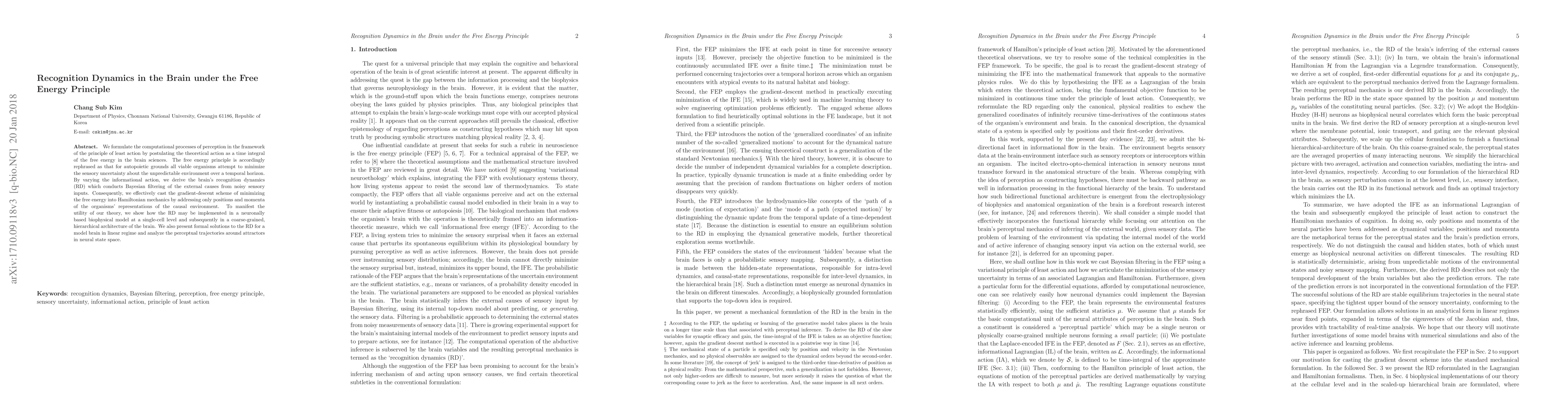 We formulate the computational processes of perception in the framework of the principle of least action by postulating the theoretical action as a time integral of the free energy in the brain sciences. The free energy principle is accordingly rephrased as that for autopoietic grounds all viable organisms attempt to minimize the sensory uncertainty about the unpredictable environment over a temporal horizon. By varying the informational action, we derive the brain's recognition dynamics (RD) which conducts Bayesian filtering of the external causes from noisy sensory inputs. Consequently, we effectively cast the gradient-descent scheme of minimizing the free energy into Hamiltonian mechanics by addressing only positions and momenta of the organisms' representations of the causal environment. To manifest the utility of our theory, we show how the RD may be implemented in a neuronally based biophysical model at a single-cell level and subsequently in a coarse-grained, hierarchical architecture of the brain. We also present formal solutions to the RD for a model brain in linear regime and analyze the perceptual trajectories around attractors in neural state space.