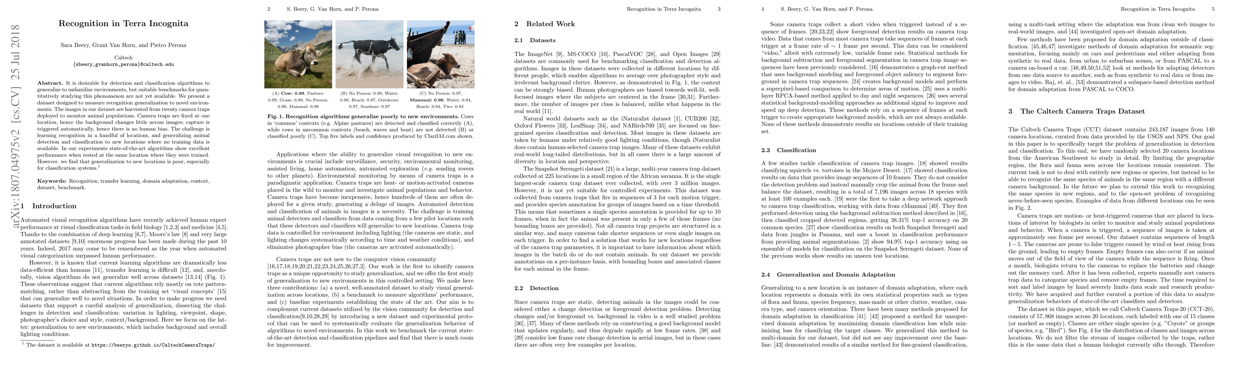 It is desirable for detection and classification algorithms to generalize to unfamiliar environments, but suitable benchmarks for quantitatively studying this phenomenon are not yet available. We present a dataset designed to measure recognition generalization to novel environments. The images in our dataset are harvested from twenty camera traps deployed to monitor animal populations. Camera traps are fixed at one location, hence the background changes little across images; capture is triggered automatically, hence there is no human bias. The challenge is learning recognition in a handful of locations, and generalizing animal detection and classification to new locations where no training data is available. In our experiments state-of-the-art algorithms show excellent performance when tested at the same location where they were trained. However, we find that generalization to new locations is poor, especially for classification systems.