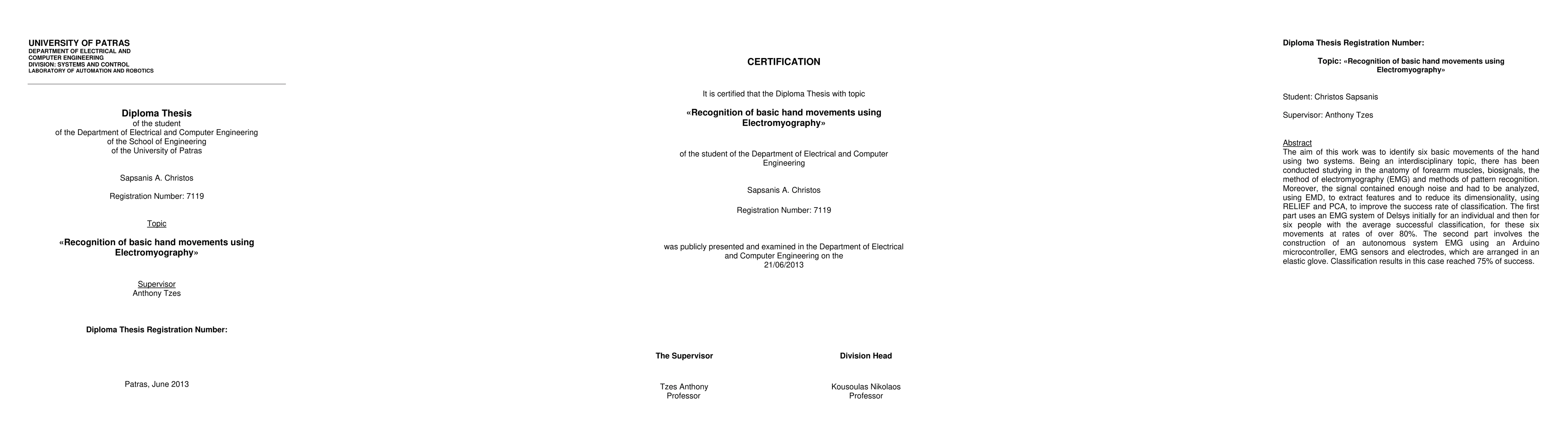 This study aims to recognize six basic hand movements using electromyography (EMG) and pattern recognition techniques. The research achieved over 80% classification success with a commercial EMG system and 75% with a custom-built EMG system using an Arduino microcontroller.