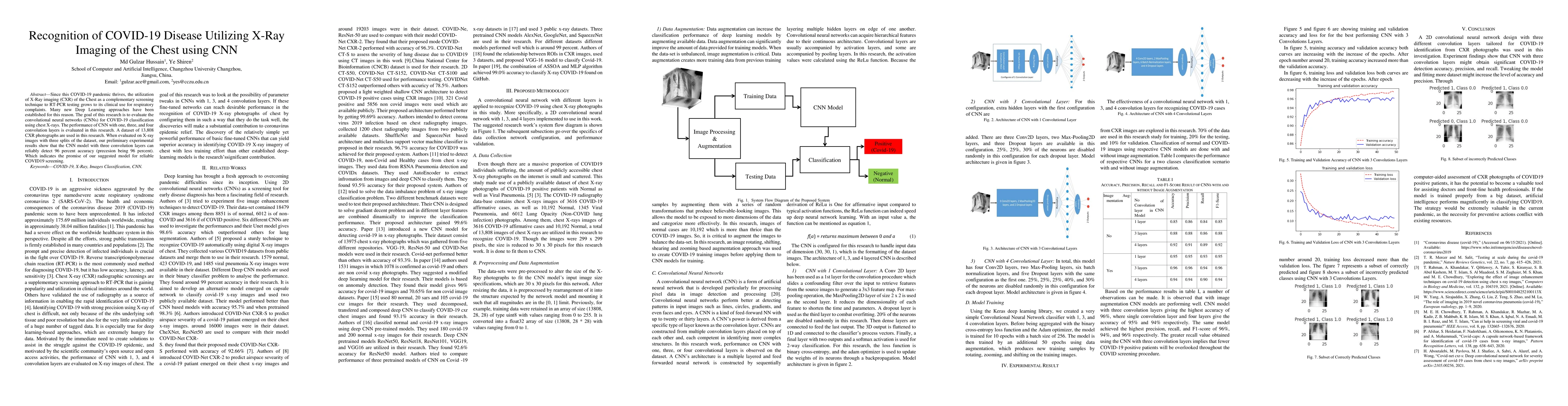 Since this COVID-19 pandemic thrives, the utilization of X-Ray images of the Chest (CXR) as a complementary screening technique to RT-PCR testing grows to its clinical use for respiratory complaints. Many new deep learning approaches have developed as a consequence. The goal of this research is to assess the convolutional neural networks (CNNs) to diagnosis COVID-19 utisizing X-ray images of chest. The performance of CNN with one, three, and four convolution layers has been evaluated in this research. A dataset of 13,808 CXR photographs are used in this research. When evaluated on X-ray images with three splits of the dataset, our preliminary experimental results show that the CNN model with three convolution layers can reliably detect with 96 percent accuracy (precision being 96 percent). This fact indicates the commitment of our suggested model for reliable screening of COVID-19.