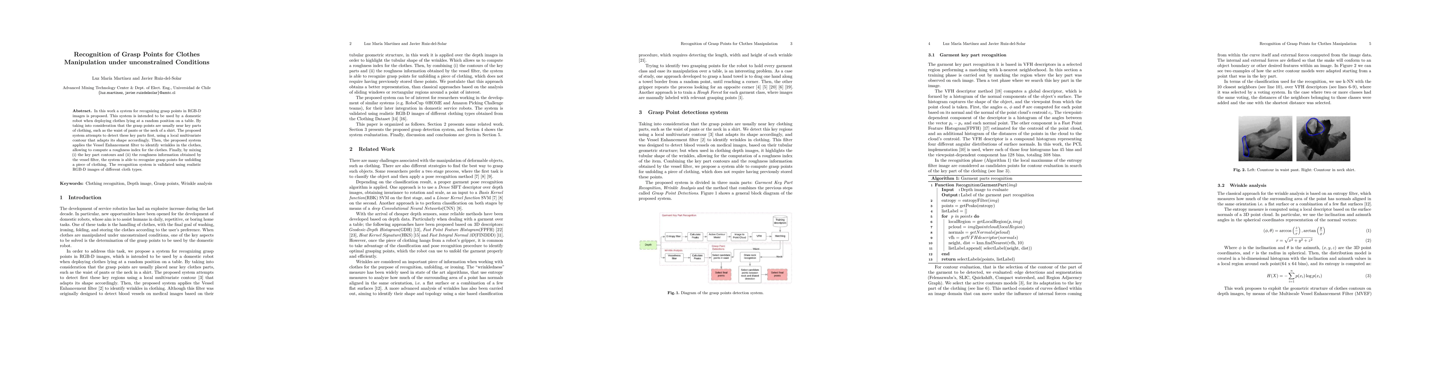 In this work a system for recognizing grasp points in RGB-D images is proposed. This system is intended to be used by a domestic robot when deploying clothes lying at a random position on a table. By taking into consideration that the grasp points are usually near key parts of clothing, such as the waist of pants or the neck of a shirt. The proposed system attempts to detect these key parts first, using a local multivariate contour that adapts its shape accordingly. Then, the proposed system applies the Vessel Enhancement filter to identify wrinkles in the clothes, allowing to compute a roughness index for the clothes. Finally, by mixing (i) the key part contours and (ii) the roughness information obtained by the vessel filter, the system is able to recognize grasp points for unfolding a piece of clothing. The recognition system is validated using realistic RGB-D images of different cloth types.