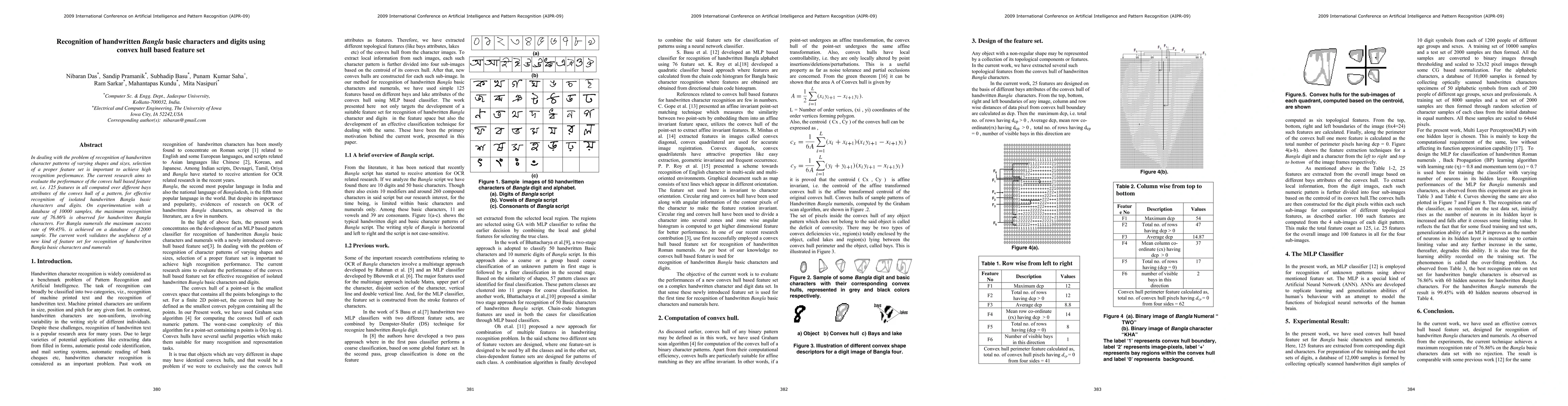This research investigates the use of convex hull-based features for recognizing handwritten Bangla basic characters and digits, achieving a 76.86% recognition rate for characters and a 99.45% success rate for numerals on respective databases, validating the effectiveness of this feature set.