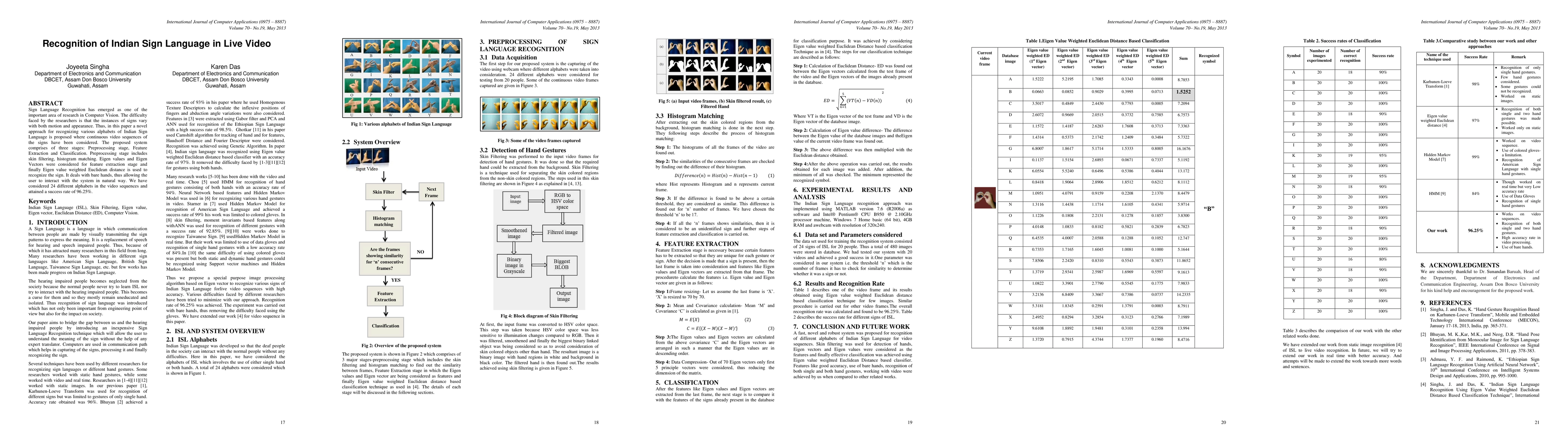This research proposes a system for recognizing Indian Sign Language alphabets in live videos using image preprocessing, feature extraction with Eigenvalues, and classification, achieving a 96.25% success rate. It enables natural interaction by recognizing signs made with bare hands in real-time.