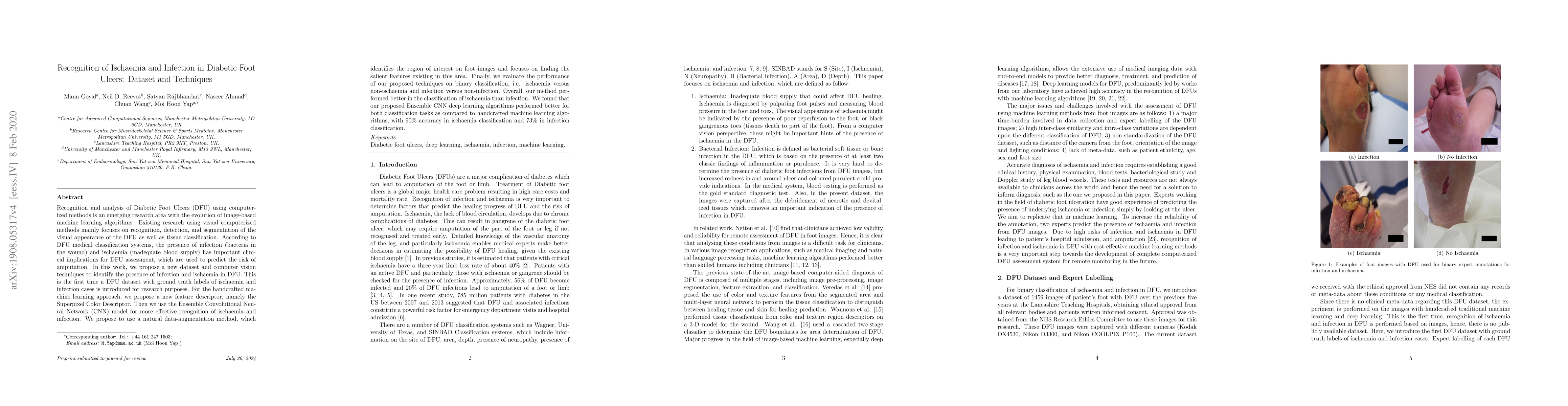 This paper introduces a novel dataset for recognizing ischaemia and infection in Diabetic Foot Ulcers (DFU) and proposes computer vision techniques, including a Superpixel Color Descriptor and an Ensemble Convolutional Neural Network (CNN) model, to classify these conditions. The Ensemble CNN model achieved 90% accuracy for ischaemia and 73% for infection, outperforming handcrafted machine learning methods.