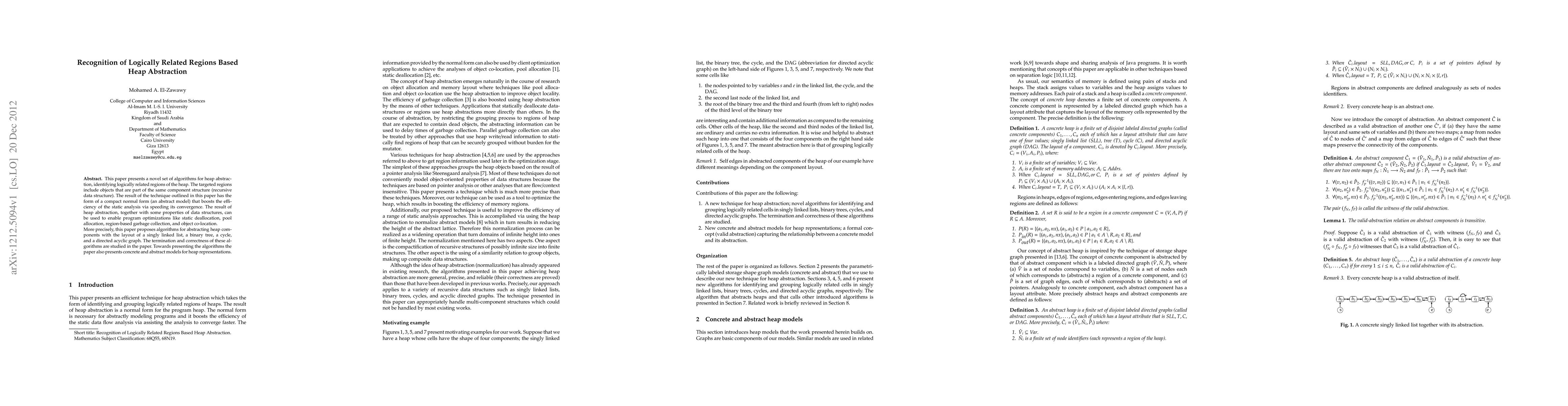 This paper introduces algorithms for heap abstraction to identify logically related regions, particularly objects within the same component structure. The proposed method results in a compact abstract model that enhances static analysis efficiency and enables optimizations such as static deallocation and region-based garbage collection.