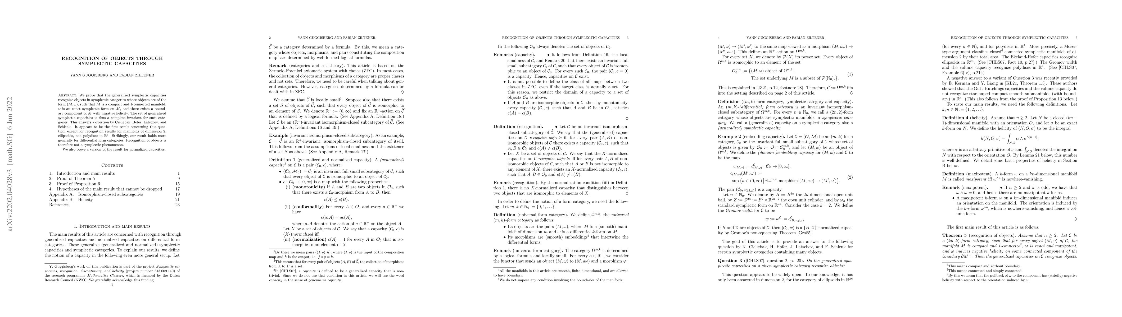 Researchers prove that symplectic capacities can recognize objects in certain categories of manifolds, providing a complete invariant for these categories. This finding holds more generally for differential form categories, indicating recognition is not exclusive to symplectic phenomena.