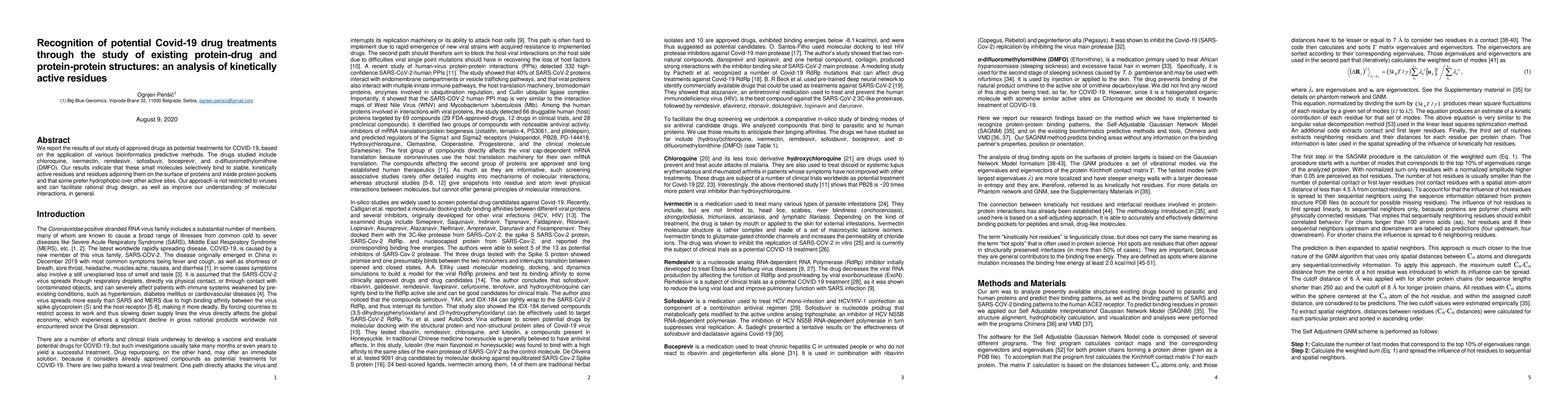 We report the results of our study of approved drugs as potential treatments for COVID 19, based on the application of various bioinformatics predictive methods. The drugs studied include chloroquine, ivermectin, remdesivir, sofosbuvir, boceprevir, and {\alpha}-difluoromethylornithine (DMFO). Our results indicate that these small molecules selectively bind to stable, kinetically active residues and residues adjoining them on the surface of proteins and inside protein pockets and that some prefer hydrophobic over other active sites. Our approach is not restricted to viruses and can facilitate rational drug design, as well as improve our understanding of molecular interactions, in general.