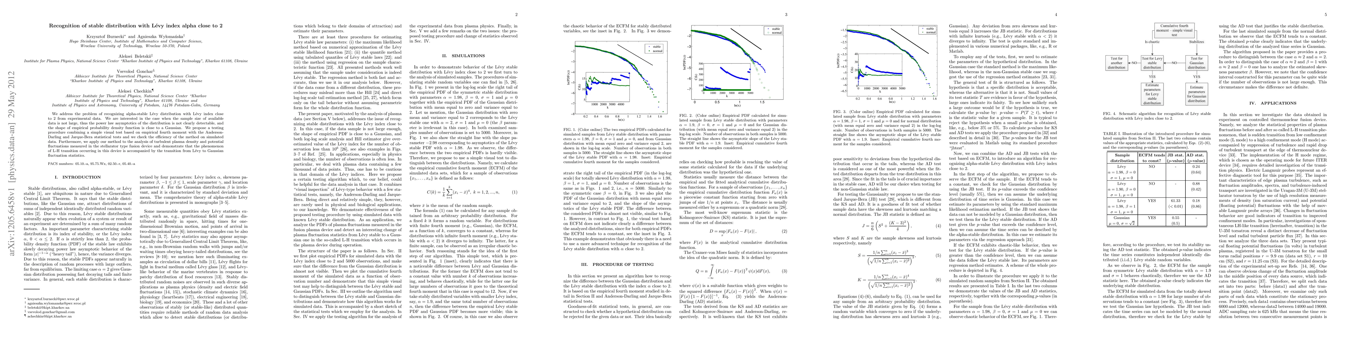 This paper proposes a method for recognizing alpha-stable Lévy distributions with an alpha close to 2 using a combination of visual and statistical tests, validated on simulated data. It also applies the method to analyze plasma density fluctuations in a fusion device, showing a transition from Lévy to Gaussian statistics in L-H transitions.