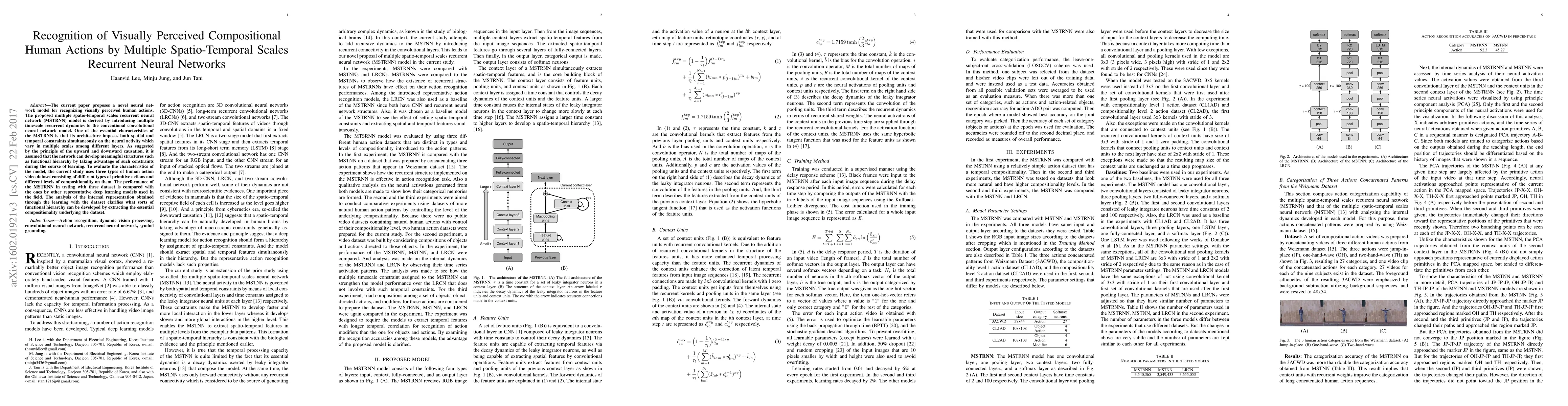 This paper introduces a novel MSTRNN model that combines multiple spatio-temporal scales recurrent dynamics to recognize visually perceived human actions. The model's architecture imposes spatial and temporal constraints across different layers, fostering functional hierarchy development, which is evaluated against other deep learning models using various human action datasets.