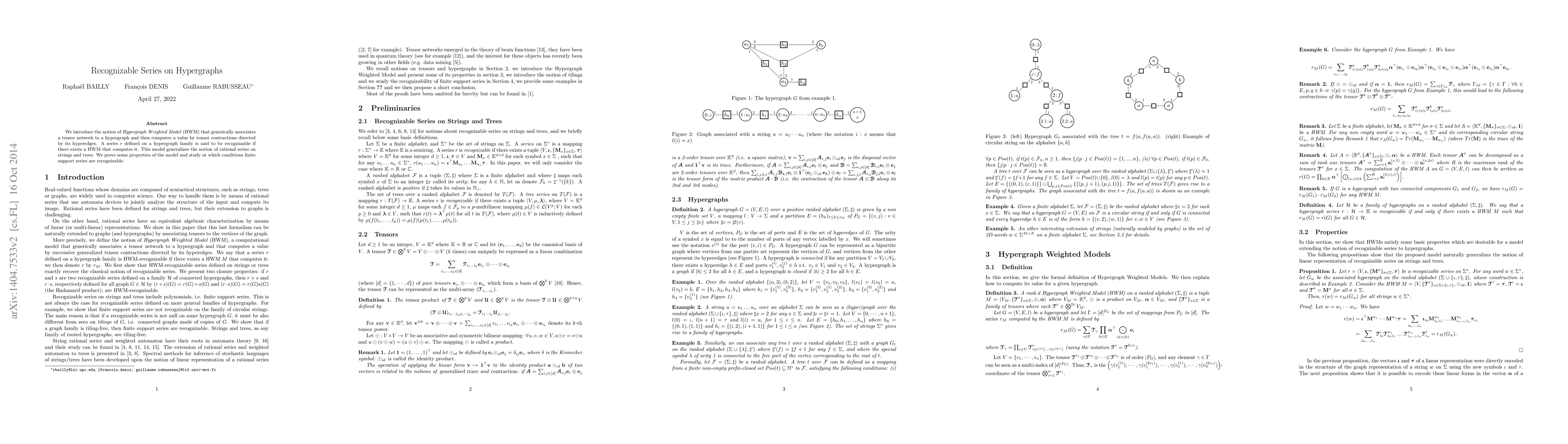 This paper introduces the Hypergraph Weighted Model (HWM) to associate tensor networks with hypergraphs and compute values via tensor contractions. Recognizable series on hypergraphs are those that can be computed by an HWM, generalizing rational series on strings and trees, and the paper explores conditions under which finite support series are recognizable.