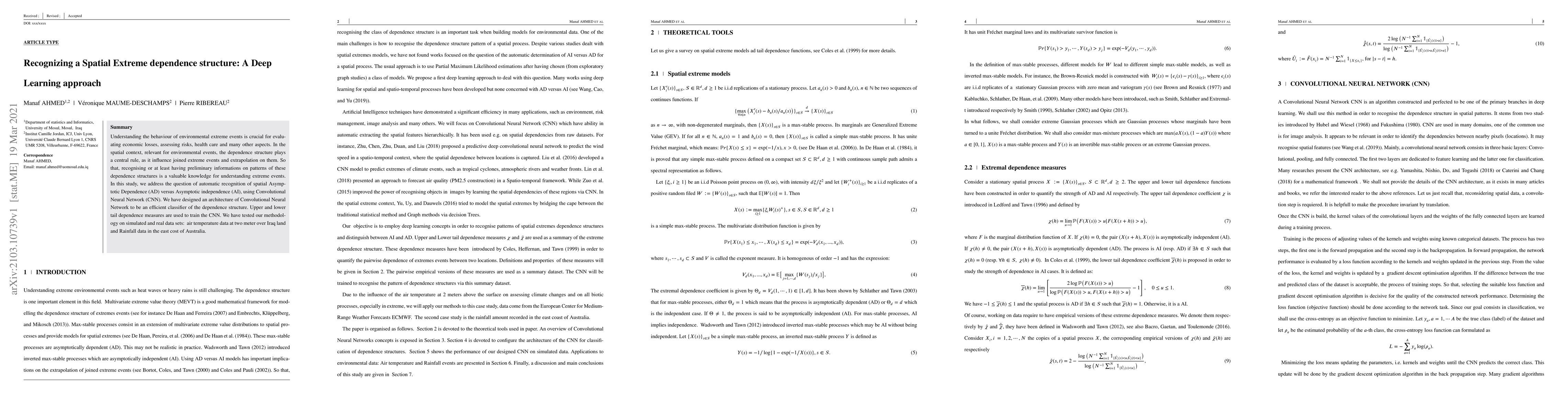 Understanding the behaviour of environmental extreme events is crucial for evaluating economic losses, assessing risks, health care and many other aspects. In the spatial context, relevant for environmental events, the dependence structure plays a central rule, as it influence joined extreme events and extrapolation on them. So that, recognising or at least having preliminary informations on patterns of these dependence structures is a valuable knowledge for understanding extreme events. In this study, we address the question of automatic recognition of spatial Asymptotic Dependence (AD) versus Asymptotic independence (AI), using Convolutional Neural Network (CNN). We have designed an architecture of Convolutional Neural Network to be an efficient classifier of the dependence structure. Upper and lower tail dependence measures are used to train the CNN. We have tested our methodology on simulated and real data sets: air temperature data at two meter over Iraq land and Rainfall data in the east cost of Australia.