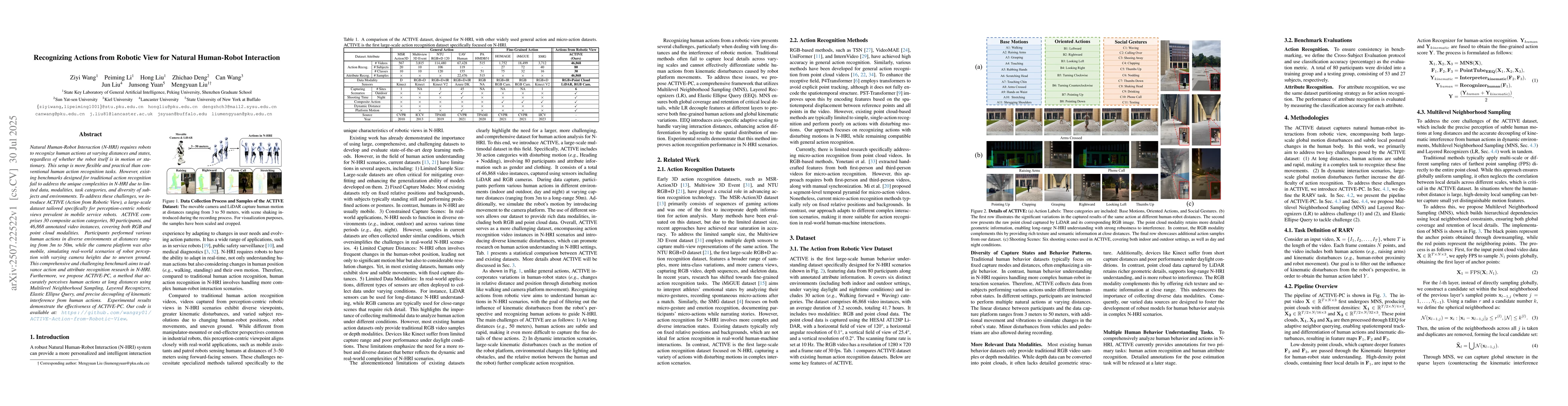 Natural Human-Robot Interaction (N-HRI) requires robots to recognize human actions at varying distances and states, regardless of whether the robot itself is in motion or stationary. This setup is more flexible and practical than conventional human action recognition tasks. However, existing benchmarks designed for traditional action recognition fail to address the unique complexities in N-HRI due to limited data, modalities, task categories, and diversity of subjects and environments. To address these challenges, we introduce ACTIVE (Action from Robotic View), a large-scale dataset tailored specifically for perception-centric robotic views prevalent in mobile service robots. ACTIVE comprises 30 composite action categories, 80 participants, and 46,868 annotated video instances, covering both RGB and point cloud modalities. Participants performed various human actions in diverse environments at distances ranging from 3m to 50m, while the camera platform was also mobile, simulating real-world scenarios of robot perception with varying camera heights due to uneven ground. This comprehensive and challenging benchmark aims to advance action and attribute recognition research in N-HRI. Furthermore, we propose ACTIVE-PC, a method that accurately perceives human actions at long distances using Multilevel Neighborhood Sampling, Layered Recognizers, Elastic Ellipse Query, and precise decoupling of kinematic interference from human actions. Experimental results demonstrate the effectiveness of ACTIVE-PC. Our code is available at: https://github.com/wangzy01/ACTIVE-Action-from-Robotic-View.