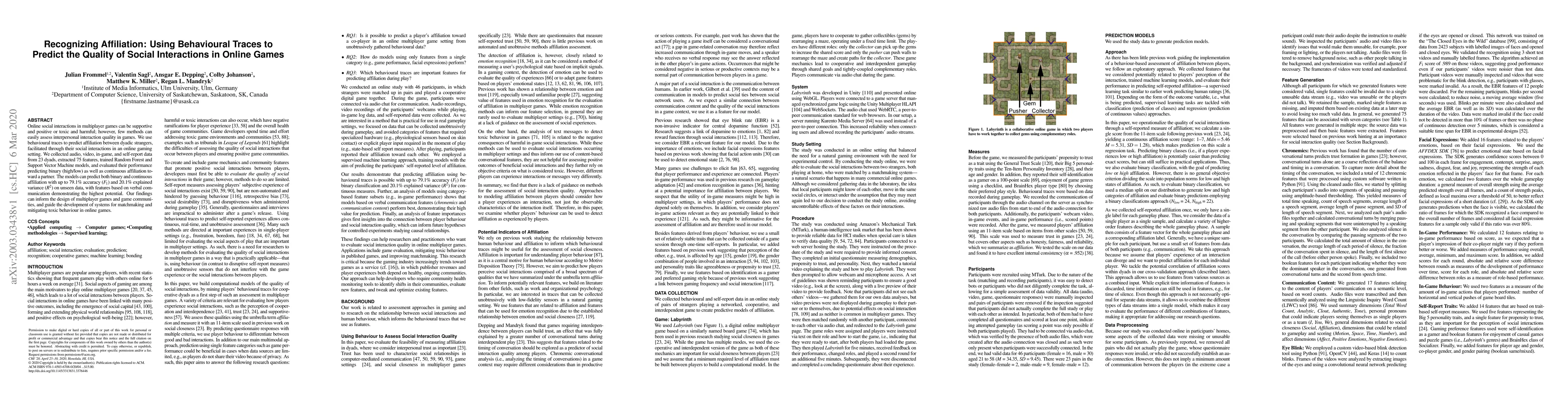 Online social interactions in multiplayer games can be supportive and positive or toxic and harmful; however, few methods can easily assess interpersonal interaction quality in games. We use behavioural traces to predict affiliation between dyadic strangers, facilitated through their social interactions in an online gaming setting. We collected audio, video, in-game, and self-report data from 23 dyads, extracted 75 features, trained Random Forest and Support Vector Machine models, and evaluated their performance predicting binary (high/low) as well as continuous affiliation toward a partner. The models can predict both binary and continuous affiliation with up to 79.1% accuracy (F1) and 20.1% explained variance (R2) on unseen data, with features based on verbal communication demonstrating the highest potential. Our findings can inform the design of multiplayer games and game communities, and guide the development of systems for matchmaking and mitigating toxic behaviour in online games.