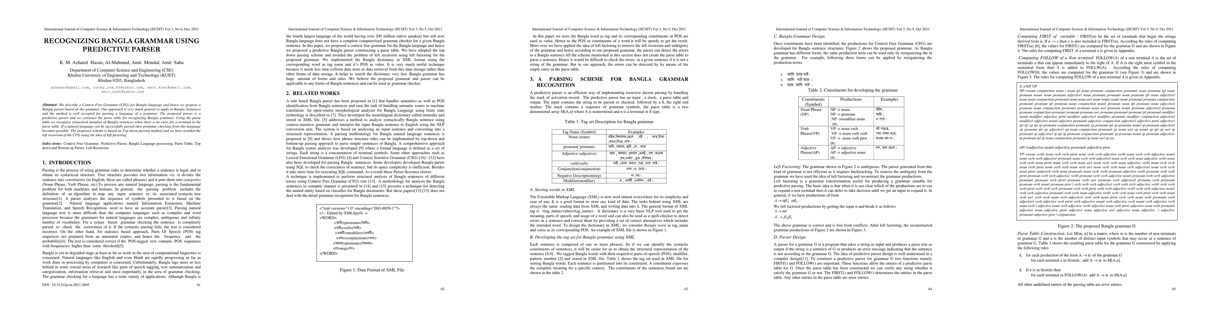 This paper proposes a Context Free Grammar (CFG) for Bangla and a predictive parser based on the grammar to recognize Bangla sentences. The parser uses a parse table for syntactical error detection and employs top-down parsing with left factoring to avoid left recursion.