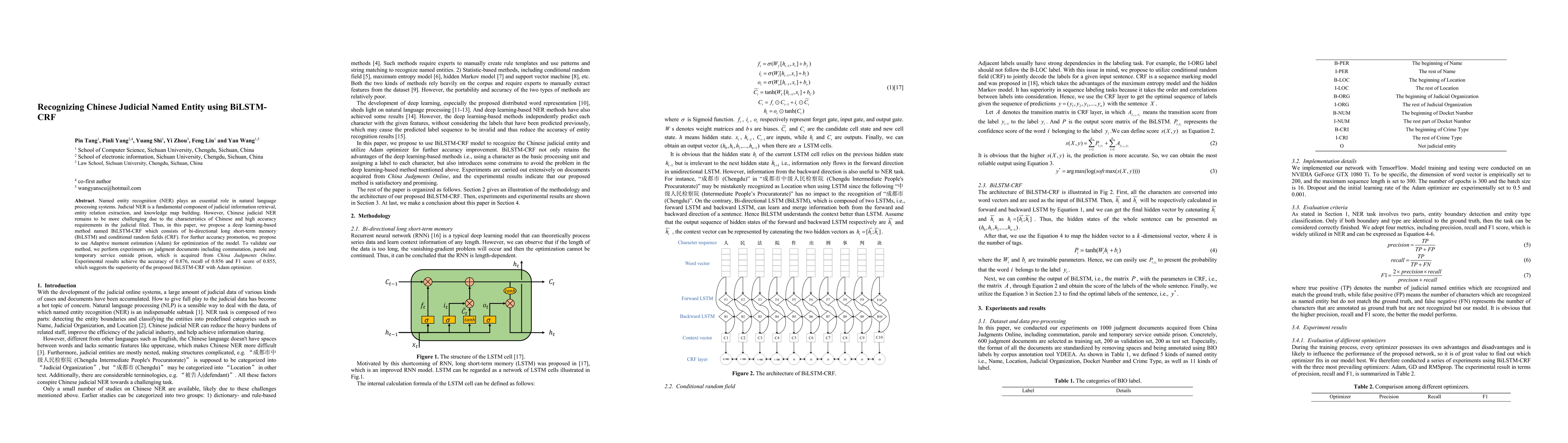 This paper proposes a BiLSTM-CRF model for recognizing Chinese judicial named entities, achieving high accuracy in judicial information retrieval. Experiments on China Judgments Online documents show an accuracy of 0.876, recall of 0.856, and F1 score of 0.855, demonstrating the effectiveness of the method.