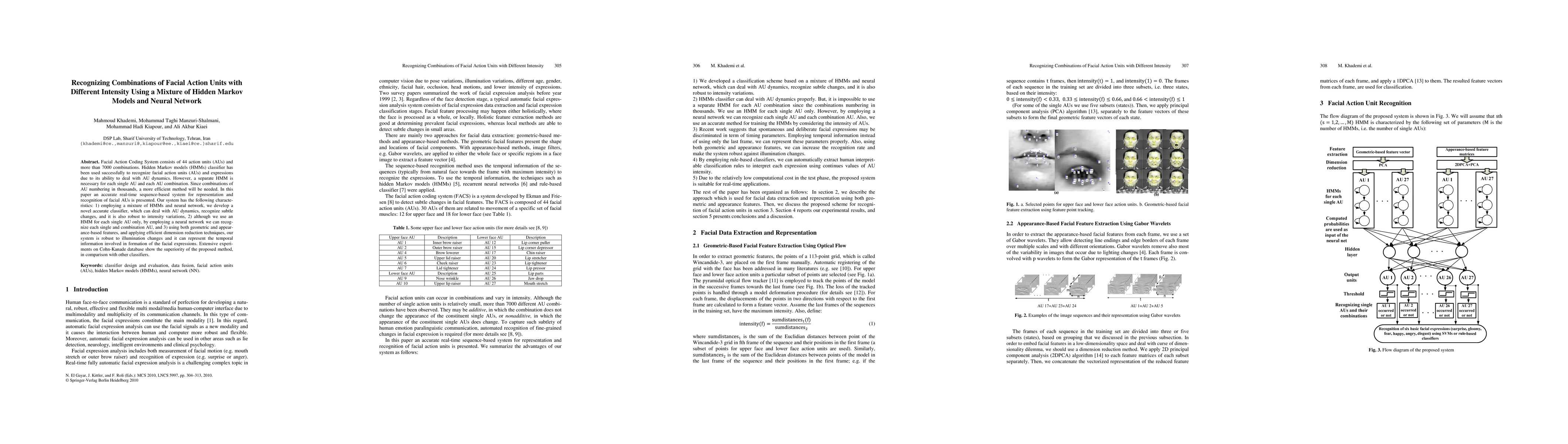Facial Action Coding System consists of 44 action units (AUs) and more than 7000 combinations. Hidden Markov models (HMMs) classifier has been used successfully to recognize facial action units (AUs) and expressions due to its ability to deal with AU dynamics. However, a separate HMM is necessary for each single AU and each AU combination. Since combinations of AU numbering in thousands, a more efficient method will be needed. In this paper an accurate real-time sequence-based system for representation and recognition of facial AUs is presented. Our system has the following characteristics: 1) employing a mixture of HMMs and neural network, we develop a novel accurate classifier, which can deal with AU dynamics, recognize subtle changes, and it is also robust to intensity variations, 2) although we use an HMM for each single AU only, by employing a neural network we can recognize each single and combination AU, and 3) using both geometric and appearance-based features, and applying efficient dimension reduction techniques, our system is robust to illumination changes and it can represent the temporal information involved in formation of the facial expressions. Extensive experiments on Cohn-Kanade database show the superiority of the proposed method, in comparison with other classifiers. Keywords: classifier design and evaluation, data fusion, facial action units (AUs), hidden Markov models (HMMs), neural network (NN).