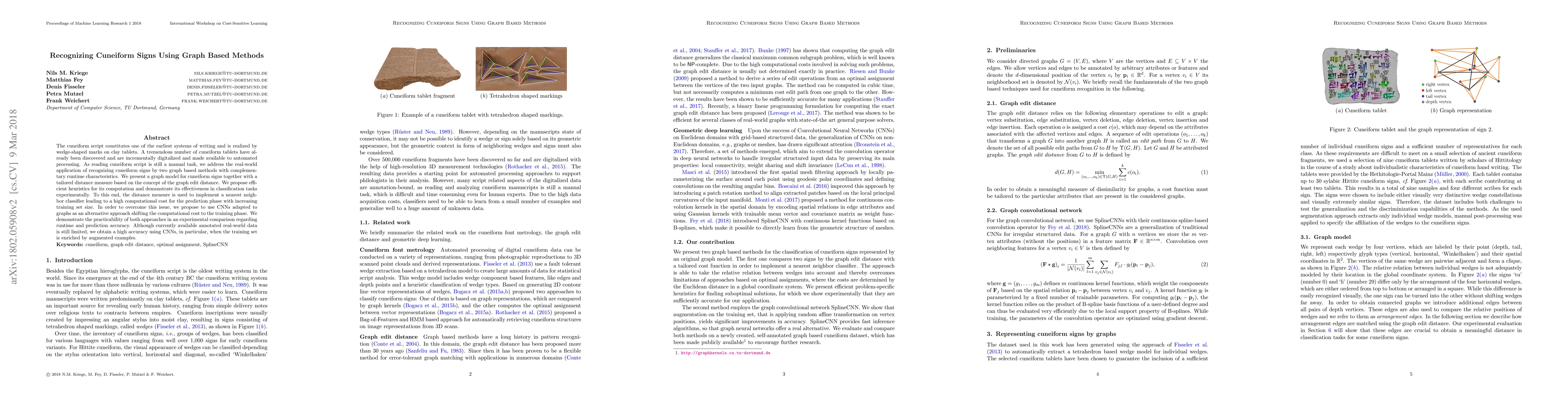 This research introduces graph-based methods to recognize cuneiform signs, presenting a graph model with a tailored distance measure. It demonstrates the effectiveness of these methods in classification tasks, while also proposing CNNs adapted to graphs to address computational cost issues. Experimental comparisons show high accuracy, particularly with augmented training data, paving the way for automated cuneiform script reading.
