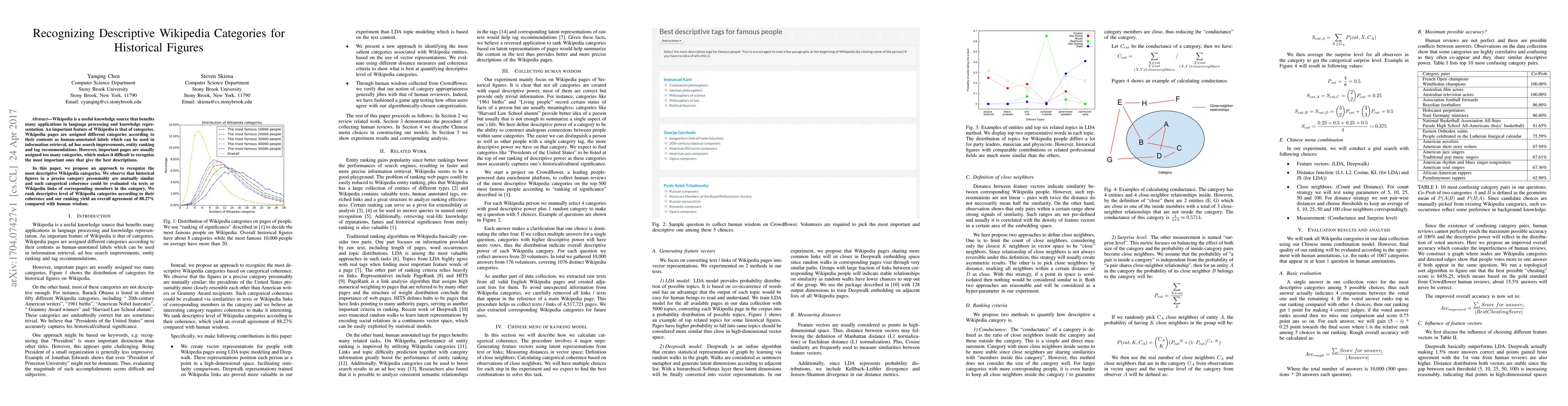 The paper proposes an approach to recognize the most descriptive Wikipedia categories for historical figures by converting text/links of Wikipedia pages into vector representations using LDA and Deepwalk models. It then measures distances between feature vectors and defines close neighbors using two strategies: limiting the count of close neighbors or picking neighbors by distance. Descriptiveness is quantified using conductance and surprise level criteria.