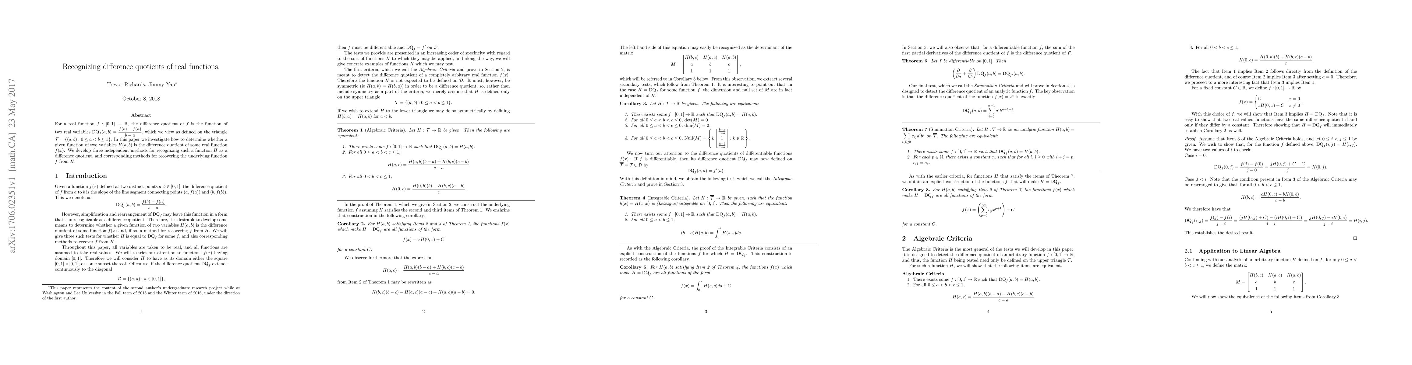 This paper develops three methods to recognize if a function of two variables is the difference quotient of a real function, enabling recovery of the underlying function from this quotient.