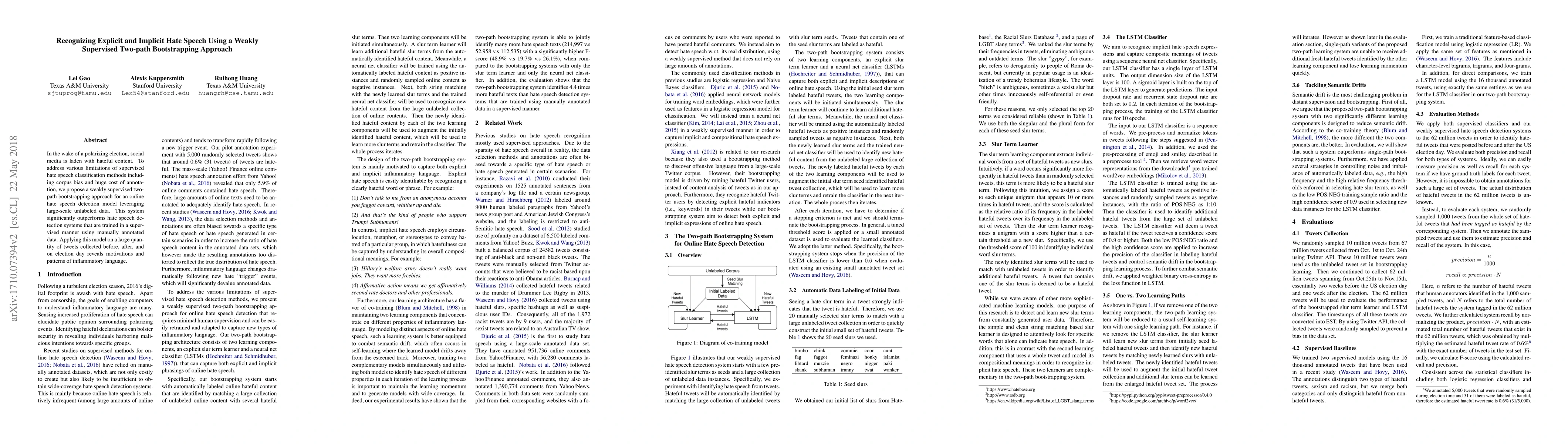 This paper proposes a weakly supervised two-path bootstrapping approach for detecting explicit and implicit hate speech in social media, addressing the limitations of supervised methods. The model leverages large-scale unlabeled data and outperforms traditional supervised systems, revealing patterns in inflammatory language around election events.