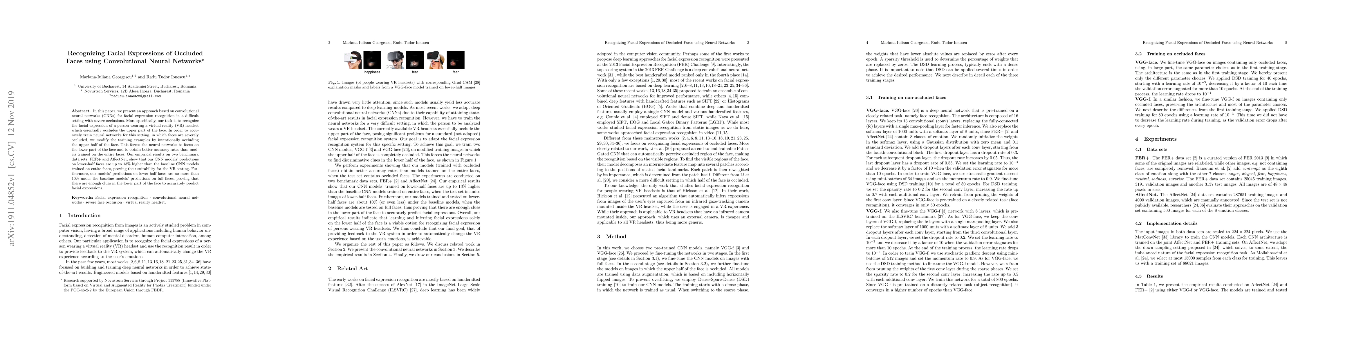 In this paper, we present an approach based on convolutional neural networks (CNNs) for facial expression recognition in a difficult setting with severe occlusions. More specifically, our task is to recognize the facial expression of a person wearing a virtual reality (VR) headset which essentially occludes the upper part of the face. In order to accurately train neural networks for this setting, in which faces are severely occluded, we modify the training examples by intentionally occluding the upper half of the face. This forces the neural networks to focus on the lower part of the face and to obtain better accuracy rates than models trained on the entire faces. Our empirical results on two benchmark data sets, FER+ and AffectNet, show that our CNN models' predictions on lower-half faces are up to 13% higher than the baseline CNN models trained on entire faces, proving their suitability for the VR setting. Furthermore, our models' predictions on lower-half faces are no more than 10% under the baseline models' predictions on full faces, proving that there are enough clues in the lower part of the face to accurately predict facial expressions.