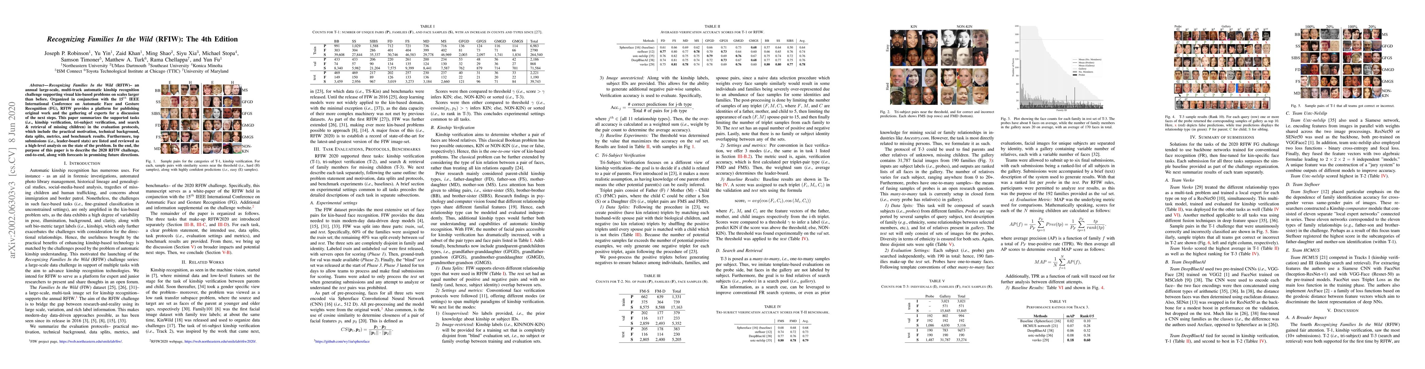 Recognizing Families In the Wild (RFIW): an annual large-scale, multi-track automatic kinship recognition evaluation that supports various visual kin-based problems on scales much higher than ever before. Organized in conjunction with the 15th IEEE International Conference on Automatic Face and Gesture Recognition (FG) as a Challenge, RFIW provides a platform for publishing original work and the gathering of experts for a discussion of the next steps. This paper summarizes the supported tasks (i.e., kinship verification, tri-subject verification, and search & retrieval of missing children) in the evaluation protocols, which include the practical motivation, technical background, data splits, metrics, and benchmark results. Furthermore, top submissions (i.e., leader-board stats) are listed and reviewed as a high-level analysis on the state of the problem. In the end, the purpose of this paper is to describe the 2020 RFIW challenge, end-to-end, along with forecasts in promising future directions.