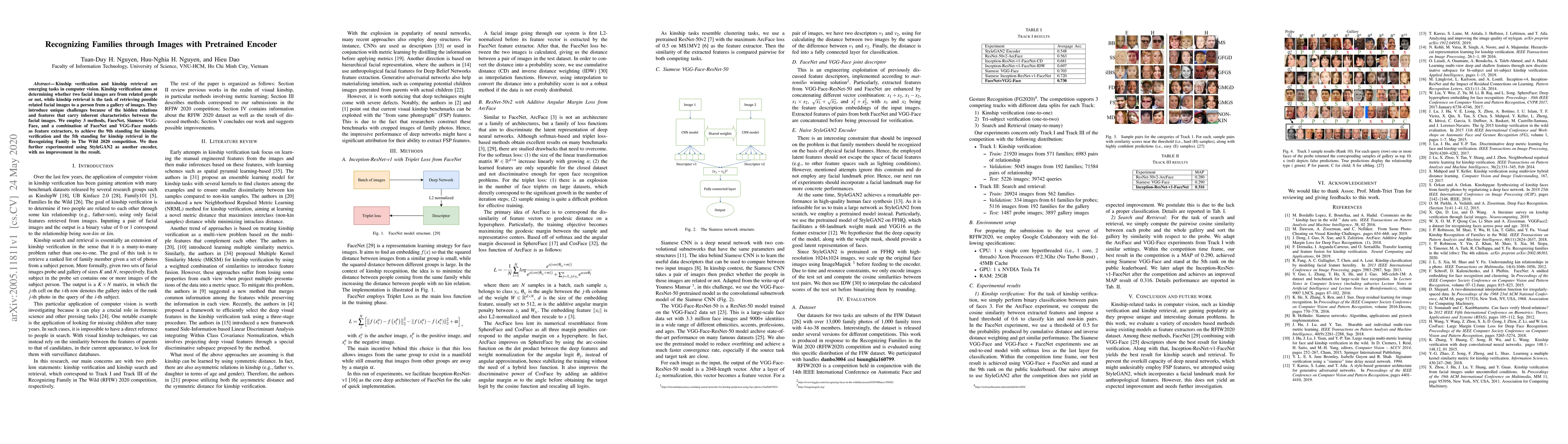 Kinship verification and kinship retrieval are emerging tasks in computer vision. Kinship verification aims at determining whether two facial images are from related people or not, while kinship retrieval is the task of retrieving possible related facial images to a person from a gallery of images. They introduce unique challenges because of the hidden relations and features that carry inherent characteristics between the facial images. We employ 3 methods, FaceNet, Siamese VGG-Face, and a combination of FaceNet and VGG-Face models as feature extractors, to achieve the 9th standing for kinship verification and the 5th standing for kinship retrieval in the Recognizing Family in The Wild 2020 competition. We then further experimented using StyleGAN2 as another encoder, with no improvement in the result.