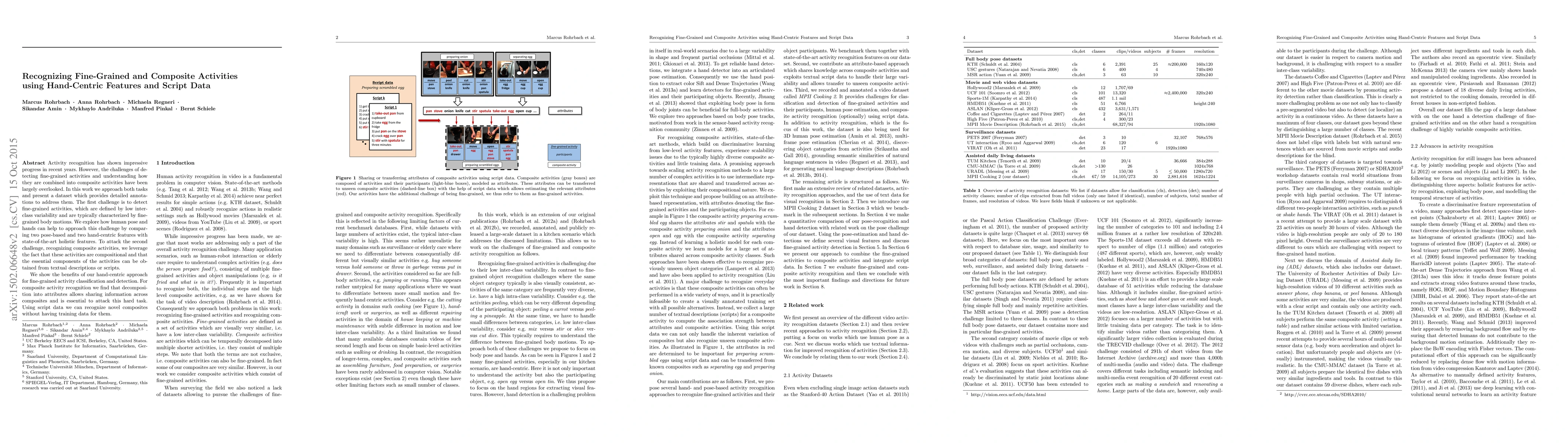 This paper presents a dataset for fine-grained and composite activity recognition, utilizing hand-centric features and script data. It compares hand-centric and pose-based features for fine-grained activity detection, and uses decomposition into attributes and script data for recognizing composite activities, showing benefits for both tasks.