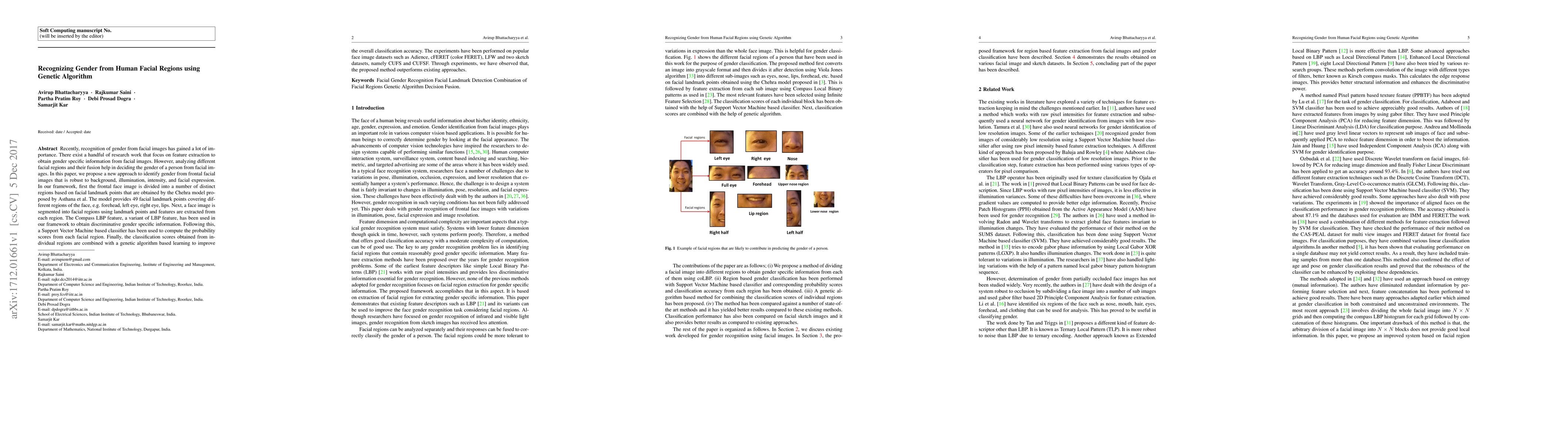 A new approach to gender recognition from facial images is proposed using a genetic algorithm-based learning framework that analyzes distinct facial regions and extracts features from each region.
