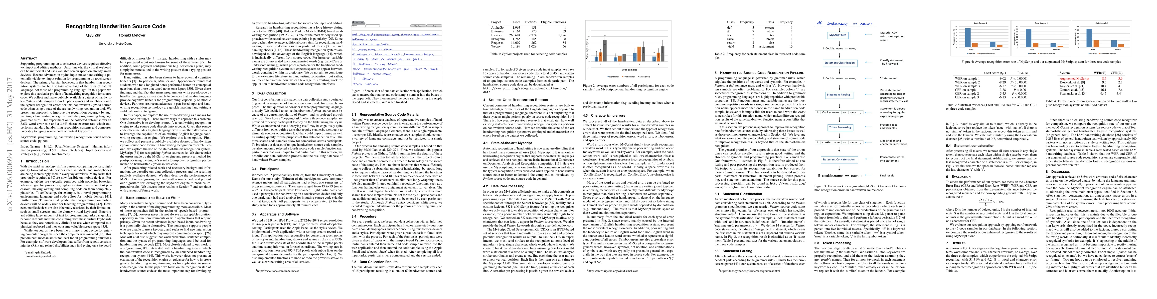 This paper investigates handwriting recognition for programming on touchscreen devices, addressing the inefficiencies of virtual keyboards. It introduces a dataset of handwritten Python code and demonstrates improved recognition accuracy by incorporating programming language grammar rules, achieving better results than standard handwriting recognition systems.