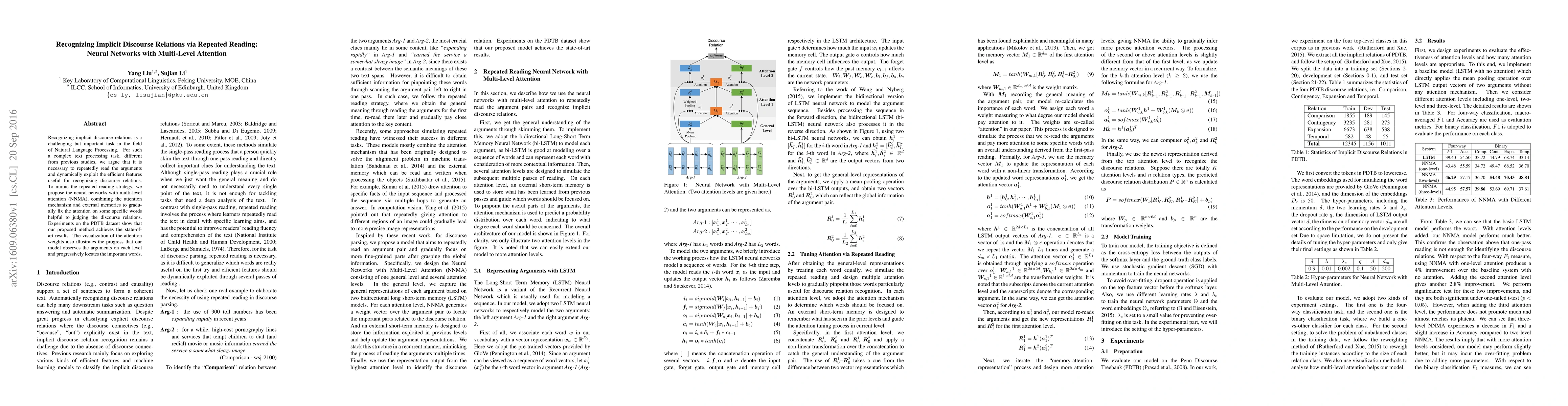 This paper proposes neural networks with multi-level attention (NNMA) to recognize implicit discourse relations by simulating repeated reading through attention mechanisms and external memories. The model achieves state-of-the-art results on the PDTB dataset and visualizations show it progressively focuses on important words.