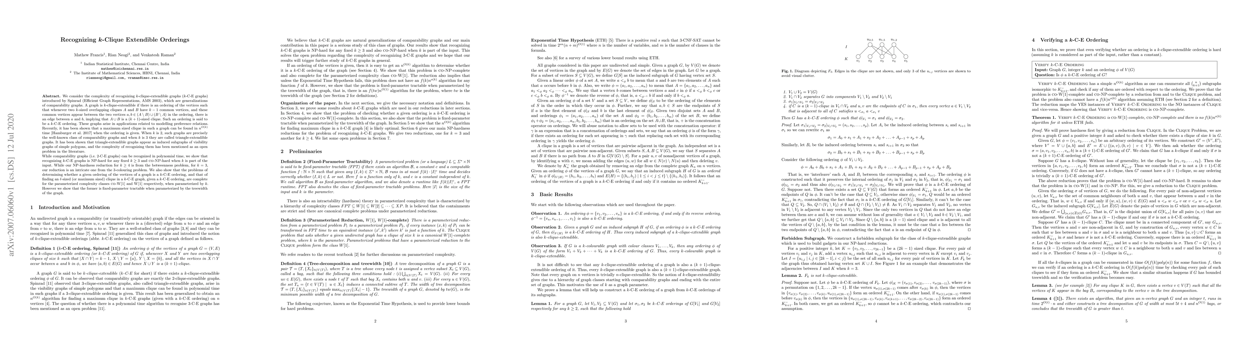 A graph is $k$-clique-extendible if there is an ordering of the vertices such that whenever two $k$-sized overlapping cliques $A$ and $B$ have $k-1$ common vertices, and these common vertices appear between the two vertices $a,b\in (A\setminus B)\cup (B\setminus A)$ in the ordering, there is an edge between $a$ and $b$, implying that $A\cup B$ is a $(k+1)$-sized clique. Such an ordering is said to be a $k$-C-E ordering. These graphs arise in applications related to modelling preference relations. Recently, it has been shown that a maximum sized clique in such a graph can be found in $n^{O(k)}$ time when the ordering is given. When $k$ is $2$, such graphs are precisely the well-known class of comparability graphs and when $k$ is $3$ they are called triangle-extendible graphs. It has been shown that triangle-extendible graphs appear as induced subgraphs of visibility graphs of simple polygons, and the complexity of recognizing them has been mentioned as an open problem in the literature. While comparability graphs (i.e. $2$-C-E graphs) can be recognized in polynomial time, we show that recognizing $k$-C-E graphs is NP-hard for any fixed $k \geq 3$ and co-NP-hard when $k$ is part of the input. While our NP-hardness reduction for $k \geq 4$ is from the betweenness problem, for $k=3$, our reduction is an intricate one from the $3$-colouring problem. We also show that the problems of determining whether a given ordering of the vertices of a graph is a $k$-C-E ordering, and that of finding an $\ell$-sized (or maximum sized) clique in a $k$-C-E graph, given a $k$-C-E ordering, are complete for the parameterized complexity classes co-W[1] and W[1] respectively, when parameterized by $k$. However we show that the former is fixed-parameter tractable when parameterized by the treewidth of the graph.