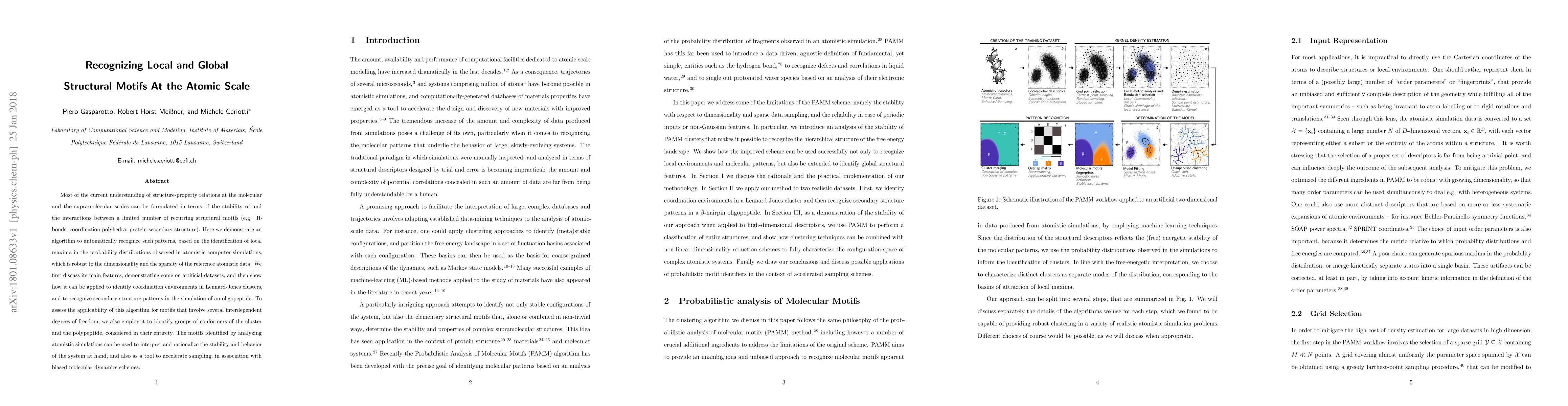Most of the current understanding of structure-property relations at the molecular and the supramolecular scales can be formulated in terms of the stability of and the interactions between a limited number of recurring structural motifs (e.g., H-bonds, coordination polyhedra, and protein secondary structure). Here we demonstrate an algorithm to automatically recognize such patterns, based on the identification of local maxima in the probability distributions observed in atomistic computer simulations, which is robust to the dimensionality and the sparsity of the reference atomistic data. We first discuss its main features, demonstrating some on artificial data sets, and then show how it can be applied to identify coordination environments in Lennard-Jones clusters and to recognize secondary-structure patterns in the simulation of an oligopeptide. To assess the applicability of this algorithm for motifs that involve several interdependent degrees of freedom, we also employ it to identify groups of conformers of the cluster and the polypeptide, considered in their entirety. The motifs identified by analyzing atomistic simulations can be used to interpret and rationalize the stability and behavior of the system at hand, and also as a tool to accelerate sampling, in association with biased molecular dynamics schemes.