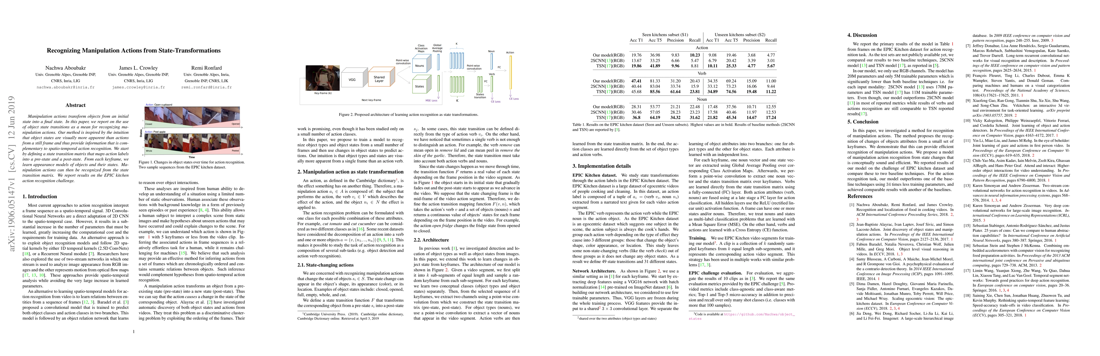 This paper proposes a method to recognize manipulation actions by analyzing object state transitions rather than directly from spatio-temporal features. It uses a state transition matrix to map actions to pre- and post-states, learning object appearance models from keyframes to identify these transitions, and demonstrates effectiveness on the EPIC kitchen dataset.