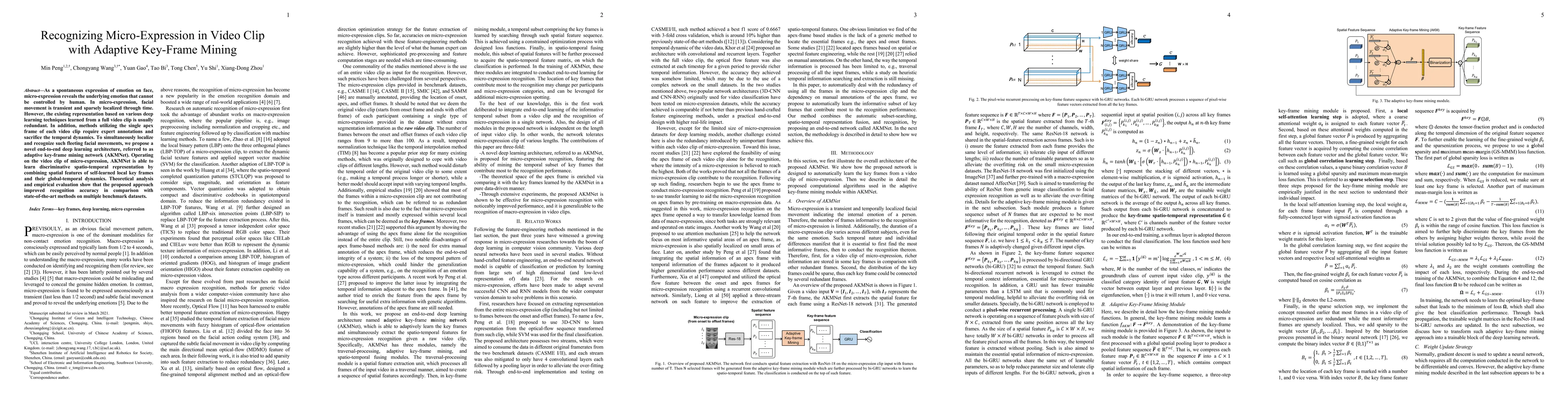 This paper proposes AKMNet, an adaptive key-frame mining network for recognizing micro-expressions in video clips by learning discriminative spatio-temporal features from self-identified local key frames. The method outperforms existing techniques by capturing fleeting facial movements without sacrificing temporal dynamics.