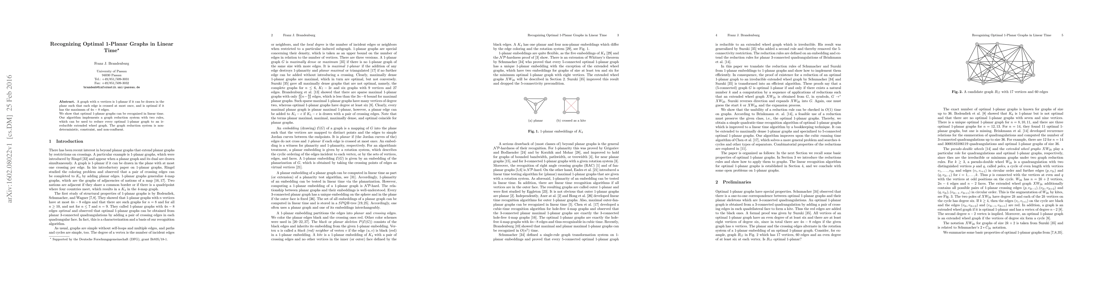 A graph with n vertices is 1-planar if it can be drawn in the plane such that each edge is crossed at most once, and is optimal if it has the maximum of 4n-8 edges. We show that optimal 1-planar graphs can be recognized in linear time. Our algorithm implements a graph reduction system with two rules, which can be used to reduce every optimal 1-planar graph to an irreducible extended wheel graph. The graph reduction system is non-deterministic, constraint, and non-confluent.