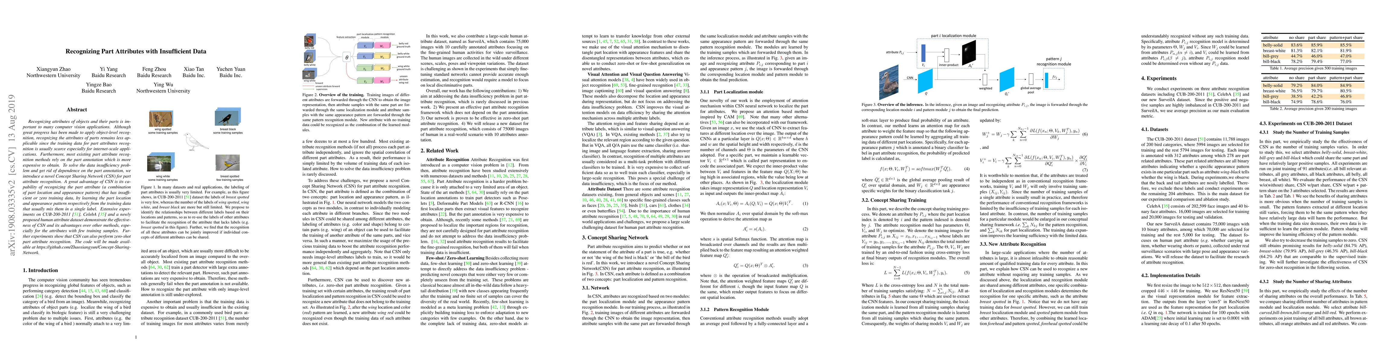 A new method called Concept Sharing Network (CSN) is introduced to recognize part attributes with insufficient data, outperforming existing methods and achieving zero-shot recognition.