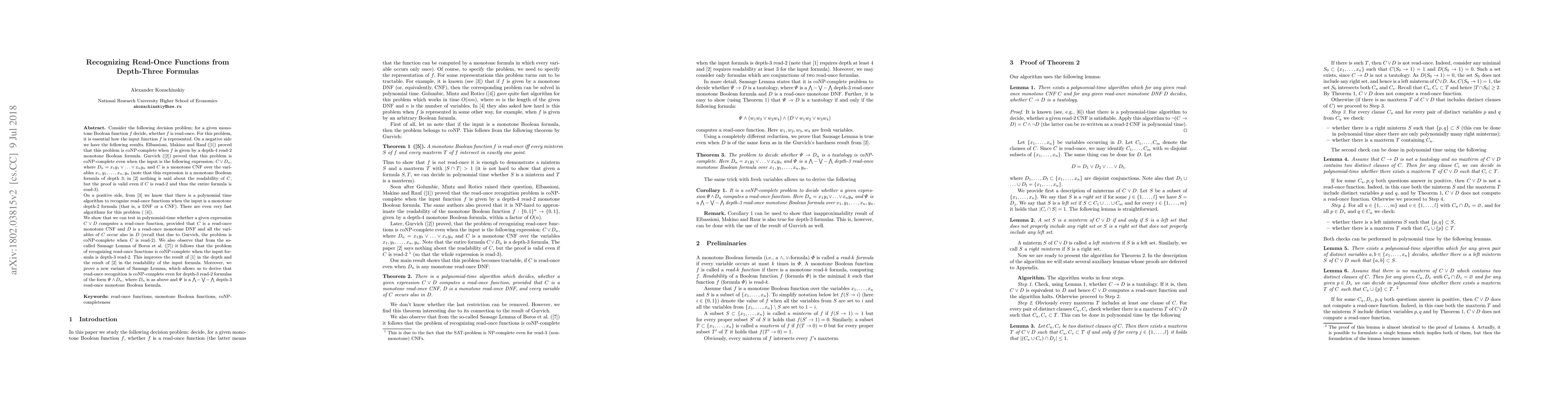 This paper presents polynomial-time tests for determining if given expressions compute read-once functions, focusing on depth-three formulas. It shows that testing if $C\lor D$ computes a read-once function is tractable when $C$ and $D$ are specific read-once monotone CNF and DNF, respectively. It also proves the coNP-completeness of deciding if $\Psi\land D_n$ computes a read-once function, improving previous results in formula depth and readability.