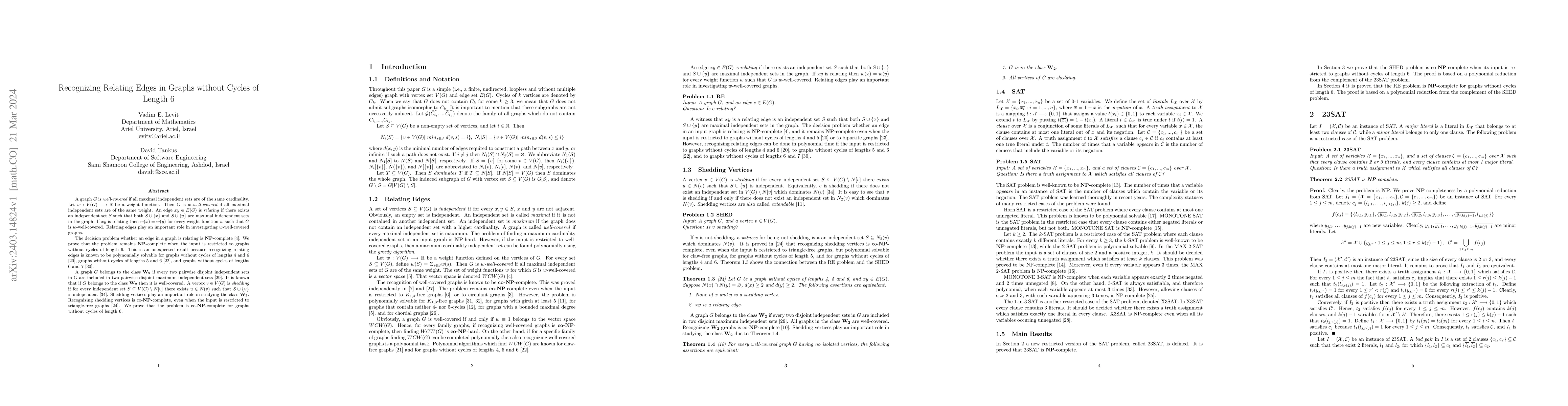 A graph $G$ is well-covered if all maximal independent sets are of the same cardinality. Let $w:V(G) \longrightarrow\mathbb{R}$ be a weight function. Then $G$ is $w$-well-covered if all maximal independent sets are of the same weight. An edge $xy \in E(G)$ is relating if there exists an independent set $S$ such that both $S \cup \{x\}$ and $S \cup \{y\}$ are maximal independent sets in the graph. If $xy$ is relating then $w(x)=w(y)$ for every weight function $w$ such that $G$ is $w$-well-covered. Relating edges play an important role in investigating $w$-well-covered graphs. The decision problem whether an edge in a graph is relating is NP-complete. We prove that the problem remains NP-complete when the input is restricted to graphs without cycles of length $6$. This is an unexpected result because recognizing relating edges is known to be polynomially solvable for graphs without cycles of lengths $4$ and $6$, graphs without cycles of lengths $5$ and $6$, and graphs without cycles of lengths $6$ and $7$. A graph $G$ belongs to the class $W_2$ if every two pairwise disjoint independent sets in $G$ are included in two pairwise disjoint maximum independent sets. It is known that if $G$ belongs to the class $W_2$, then it is well-covered. A vertex $v \in V(G)$ is shedding if for every independent set $S \subseteq V(G)-N[v]$, there exists a vertex $u \in N(v)$ such that $S \cup \{u\}$ is independent. Shedding vertices play an important role in studying the class $W_2$. Recognizing shedding vertices is co-NP-complete, even when the input is restricted to triangle-free graphs. We prove that the problem is co-NP-complete for graphs without cycles of length $6$.