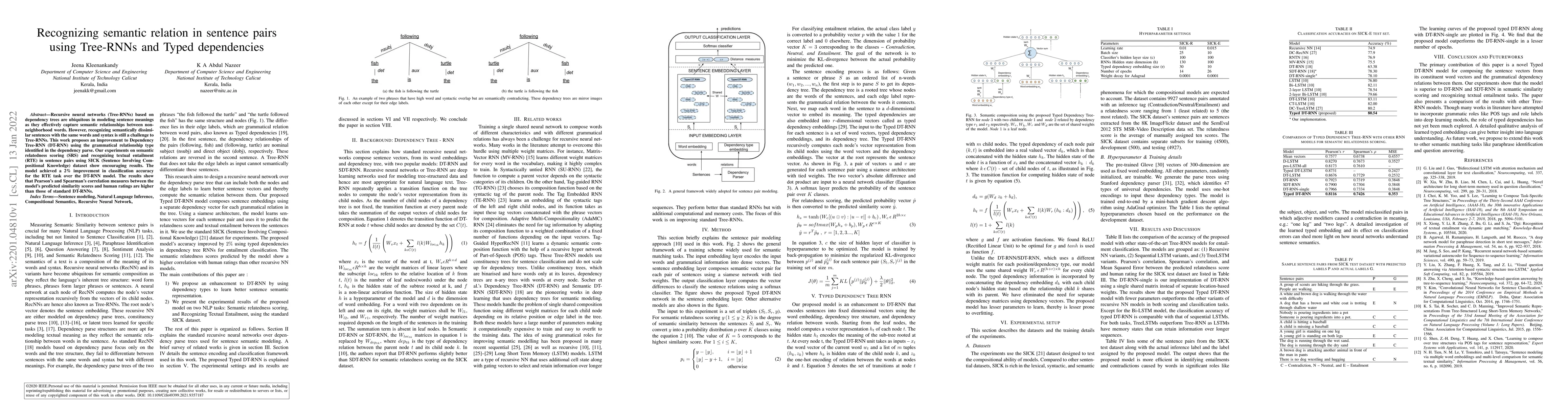 This paper proposes an enhanced Dependency Tree-RNN (DT-RNN) model that incorporates typed dependencies to better recognize semantic relations in sentence pairs, achieving a 2% improvement in textual entailment recognition accuracy. The model demonstrates higher correlation with human ratings in semantic relatedness scoring.