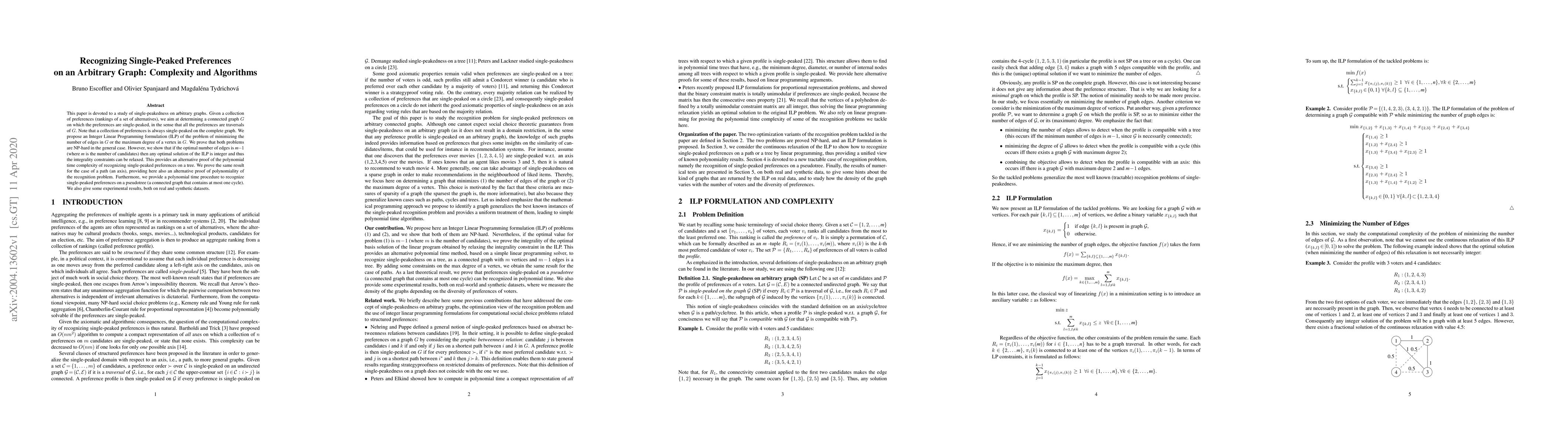 This paper studies the complexity of recognizing single-peaked preferences on arbitrary graphs, proposing an Integer Linear Programming formulation to minimize the number of edges or maximum vertex degree. It proves NP-hardness but provides polynomial-time algorithms for trees, paths, and pseudotrees.