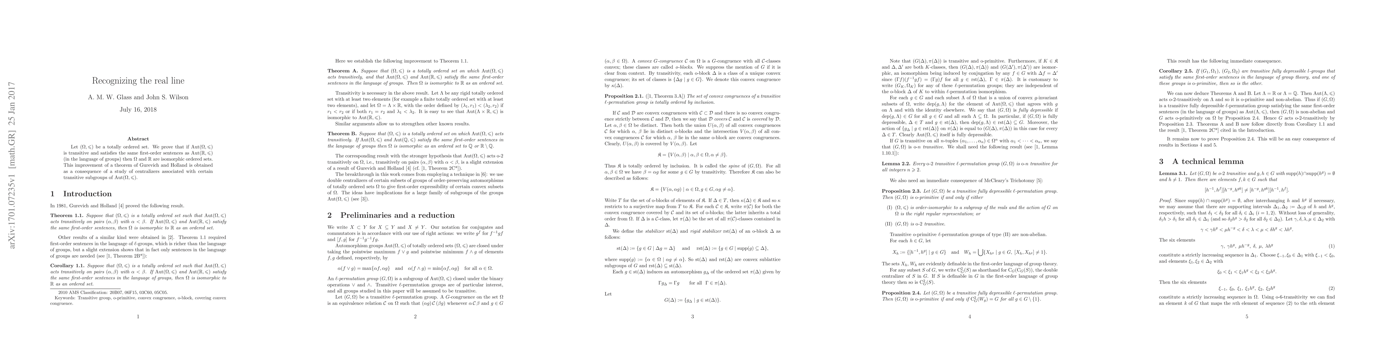 The paper proves that if a totally ordered set is transitive and has the same automorphism group as the real line, then it is isomorphic to the real line.