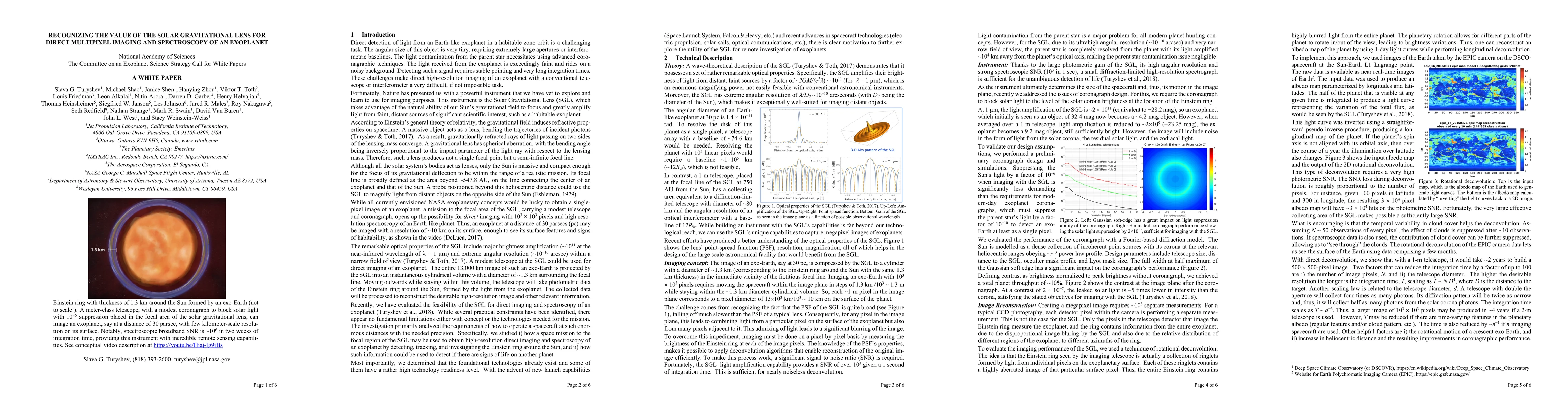 The Solar Gravitational Lens (SGL) allows for major brightness amplification ($\sim 10^{11}$ at wavelength of $1~\mu$m) and extreme angular resolution ($\sim10^{-10}$ arcsec) within a narrow field of view. A meter-class telescope, with a modest coronagraph to block solar light with 1e-6 suppression placed in the focal area of the SGL, can image an exoplanet at a distance of 30 parsec with few kilometer-scale resolution on its surface. Notably, spectroscopic broadband SNR is $\sim 10^{-6}$ in two weeks of integration time, providing this instrument with incredible remote sensing capabilities. A mission capable of exploiting the remarkable optical properties of the SGL allows for direct high-resolution imaging/spectroscopy of a potentially habitable exoplanet. Such missions could allow exploration of exoplanets relying on the SGL capabilities decades, if not centuries, earlier than possible with other extant technologies.