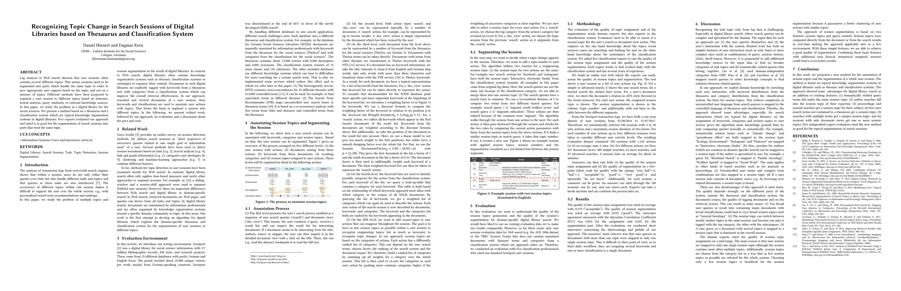 This paper proposes a method to segment search sessions in digital libraries based on a thesaurus and classification system to identify topic changes. Experts rated the approach as effective for topic segmentation, highlighting its potential for providing better user support.