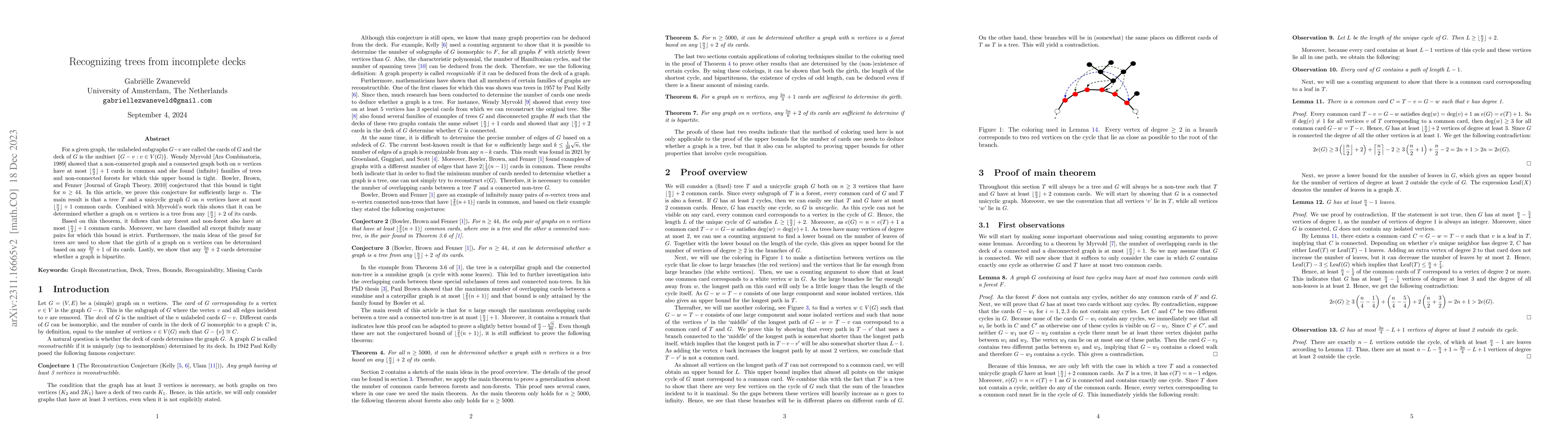 For a given graph, the unlabeled subgraphs $G-v$ are called the cards of $G$ and the deck of $G$ is the multiset $\{G-v: v \in V(G)\}$. Wendy Myrvold [Ars Combinatoria, 1989] showed that a non-connected graph and a connected graph both on $n$ vertices have at most $\lfloor \frac{n}{2} \rfloor +1$ cards in common and she found (infinite) families of trees and non-connected forests for which this upper bound is tight. Bowler, Brown, and Fenner [Journal of Graph Theory, 2010] conjectured that this bound is tight for $n \geq 44$. In this article, we prove this conjecture for sufficiently large $n$. The main result is that a tree $T$ and a unicyclic graph $G$ on $n$ vertices have at most $\lfloor \frac{n}{2} \rfloor+1$ common cards. Combined with Myrvold's work this shows that it can be determined whether a graph on $n$ vertices is a tree from any $\lfloor \frac{n}{2}\rfloor+2$ of its cards. Based on this theorem, it follows that any forest and non-forest also have at most $\lfloor \frac{n}{2} \rfloor +1$ common cards. Moreover, we have classified all except finitely many pairs for which this bound is strict. Furthermore, the main ideas of the proof for trees are used to show that the girth of a graph on $n$ vertices can be determined based on any $\frac{2n}{3} +1$ of its cards. Lastly, we show that any $\frac{5n}{6} +2$ cards determine whether a graph is bipartite.