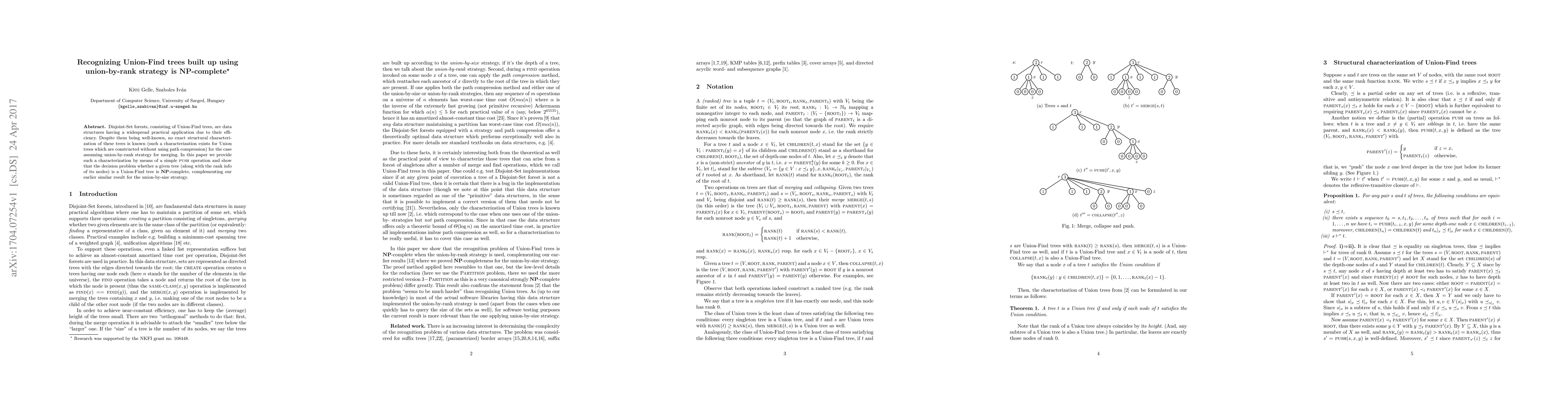 Disjoint-Set forests, consisting of Union-Find trees, are data structures having a widespread practical application due to their efficiency. Despite them being well-known, no exact structural characterization of these trees is known (such a characterization exists for Union trees which are constructed without using path compression) for the case assuming union-by-rank strategy for merging. In this paper we provide such a characterization by means of a simple push operation and show that the decision problem whether a given tree (along with the rank info of its nodes) is a Union-Find tree is NP-complete, complementing our earlier similar result for the union-by-size strategy.