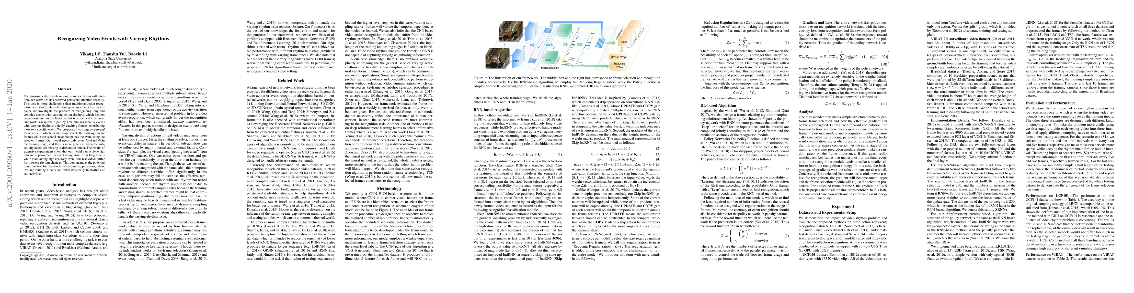 This paper introduces a two-stage end-to-end framework to recognize long, complex video events with varying action rhythms, a problem not previously addressed in literature. The method selects significant frames first, then recognizes events, using only event-level labels. Results show significant improvement in event recognition from long videos with rhythm changes, demonstrating potential for real-world video applications.