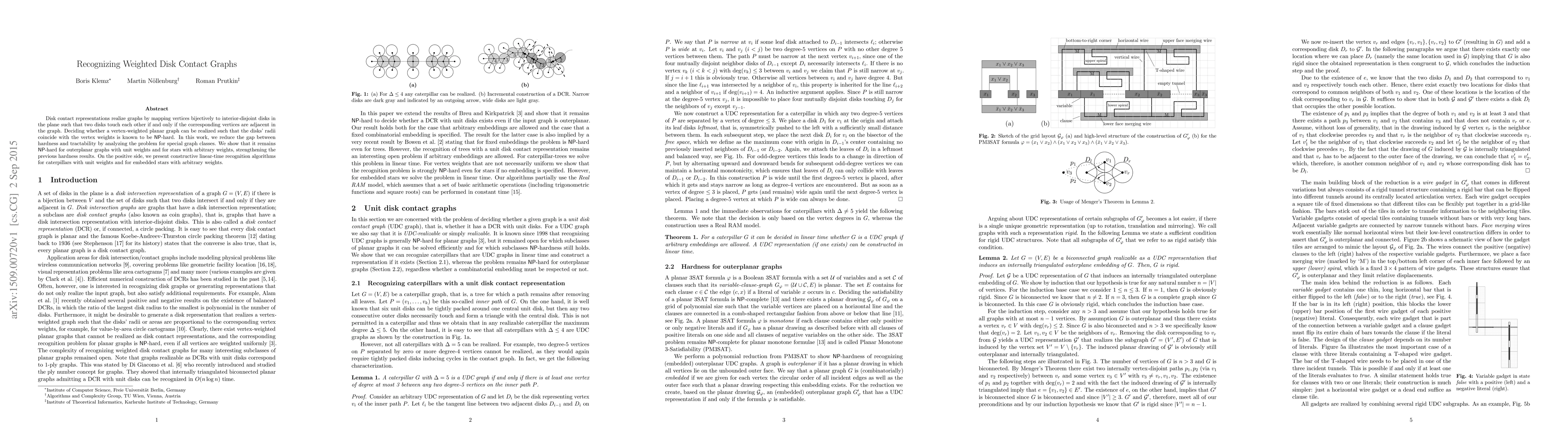 Disk contact representations realize graphs by mapping vertices bijectively to interior-disjoint disks in the plane such that two disks touch each other if and only if the corresponding vertices are adjacent in the graph. Deciding whether a vertex-weighted planar graph can be realized such that the disks' radii coincide with the vertex weights is known to be NP-hard. In this work, we reduce the gap between hardness and tractability by analyzing the problem for special graph classes. We show that it remains NP-hard for outerplanar graphs with unit weights and for stars with arbitrary weights, strengthening the previous hardness results. On the positive side, we present constructive linear-time recognition algorithms for caterpillars with unit weights and for embedded stars with arbitrary weights.