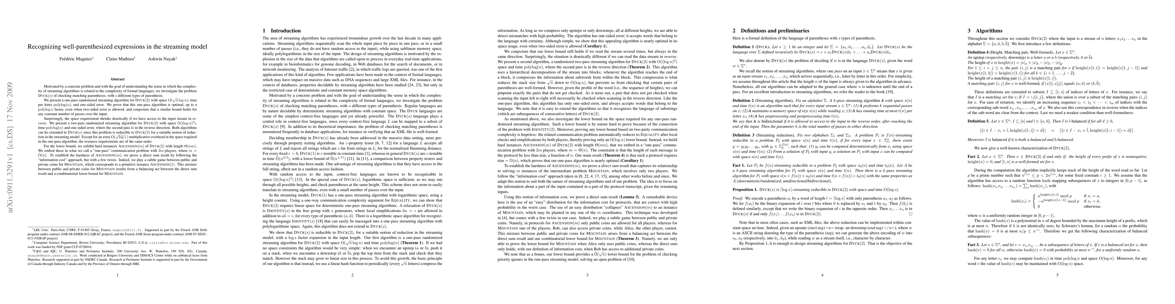 This paper presents efficient streaming algorithms for recognizing well-parenthesized expressions, specifically for Dyck(2), and proves their optimality. It introduces a one-pass algorithm with optimal space and time complexity, and a two-pass algorithm that significantly reduces space when the input stream can be processed in reverse.